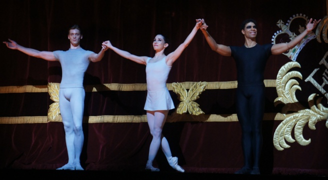 Rupert Pennefather (with Rojo and Acosta below) makes an excellent impression in this work. Tall, blonde and strikingly handsome, Pennefather dances with manly strength balanced with precise grace. Pieces featuring Acosta, Rojo and Pennefather dancing together were an absolute highlight of the ballet.