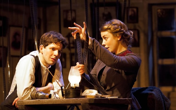 The towering set is all the more amazing for being on the same stage that She Stoops to Conquer occupied only the night before. A trio of three-story units spin and glide into place, creating a range of locations including slums, red light district, stores and an upmarket apartment block. Visionary work by Bunny Christie.