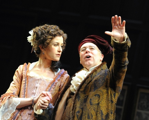 Most splendiferous of all is the fabulous achievement of Sophie Thompson (above) as Mrs Hardcastle. With the audience in her palm, Thompson’s airs and accents, not to mention her geriatric curtsy, are pure delight. Highlights included her pretense at familiarity with the fashions of London and her reading of Hasting’s letter in which she is, cruelly, referred to as a hag.