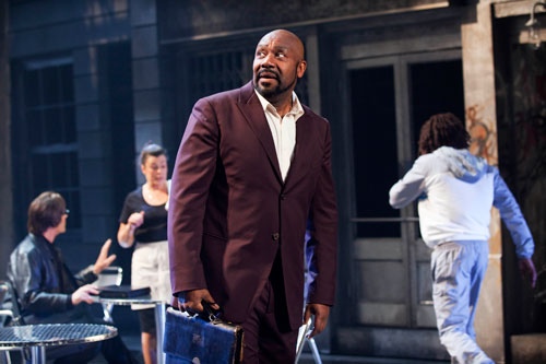 Set in current day London, the menagerie of characters are distinctly drawn, with the servant and master separated twins played by black men. Each Antipholus (Lenny Henry and Chris Jarman) is tall with shaved head and goatee while the Dromios (Lucian Msamati and Daniel Poyser) are short and pudgy with an afro.