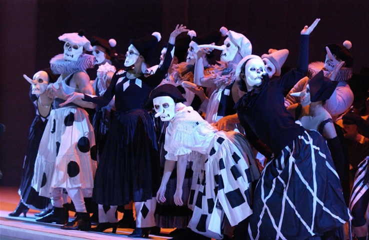 As visual accompaniment to the deathly strains of the overture, the image of Violetta on her deathbed was seen, with a young girl holding out a large ball as if to ask her to come and play. The festive music that opens act one brought partygoers, in full black formalwear and black masks, as well as a collection of black and white harlequins in ghoulish skull masks.