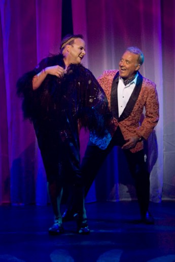 Set at the glittering St. Tropez nightclub La Cage aux Folles, the heart of the show is the loving relationship between owner Georges and star attraction Albin (Zaza). Headlining the production, John O’May and David Rogers-Smith (Albin) give towering performances in these roles. The fact that their incredible talent doesn’t wipe out the rest of the actors is testament to the terrific skills, and expert casting, of the full company.
