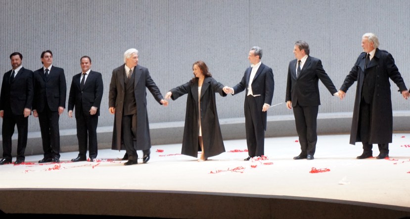 Even having seen the Salzburg production on DVD, the images on stage are still startling. Set against a steeply curved, corrugated white wall, Violetta is pursued by a teeming throng of tuxedo-clad men, then lifted and paraded on a bright red sofa. Where the current Sydney season has the giant chandelier, this staging features a giant clock, inexorably ticking towards Violetta’s final moments of life. From the massive crowd of males comes the sound of female chorus singing, and it is soon realised that the women, for effect, are all dressed as men.