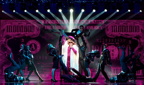Movie adaptations always require more scenes than regular musicals can handle, and this is covered by Jon Driscoll’s video and projection designs. Huge movable side and rear screens carry a sometimes dizzying array of images, taking us from downtown NY to Brooklyn to Harlem and back. Overused choreographed silhouettes quickly wear out their welcome but varying streetscapes support the action, as do the frequently used windows with spectacular views. A moving subway is one of the more exciting images created to great effect. Another nice touch is the massive display of photos, filling in part of the missing the “boy meets girl” aspect of the story. The tacky symbols paraded out for Oda Mae’s American Dream number “I’m Outa Here” are a low point.