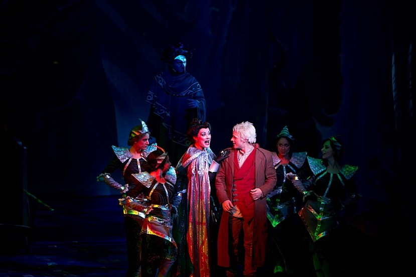 Most delightful of all is Jolyon James in the title character of Moonshadow. Although his make-up unfortunately brings to mind ’90s soapie villain Mr Bad, James turns in a wonderfully mellow performance as the well meaning but somewhat ineffective spirit. His voice is arguably the best matched to the style of music, and his stilt work is rather incredible.
