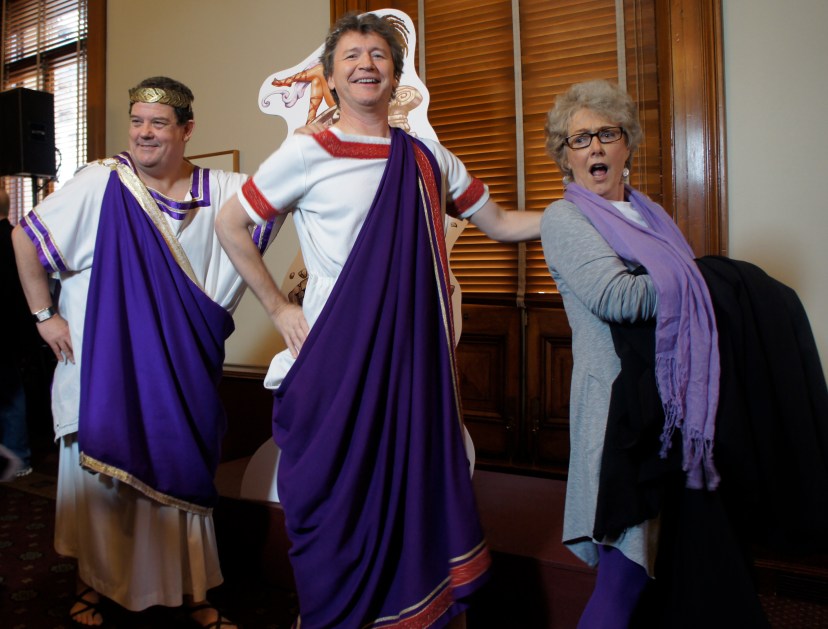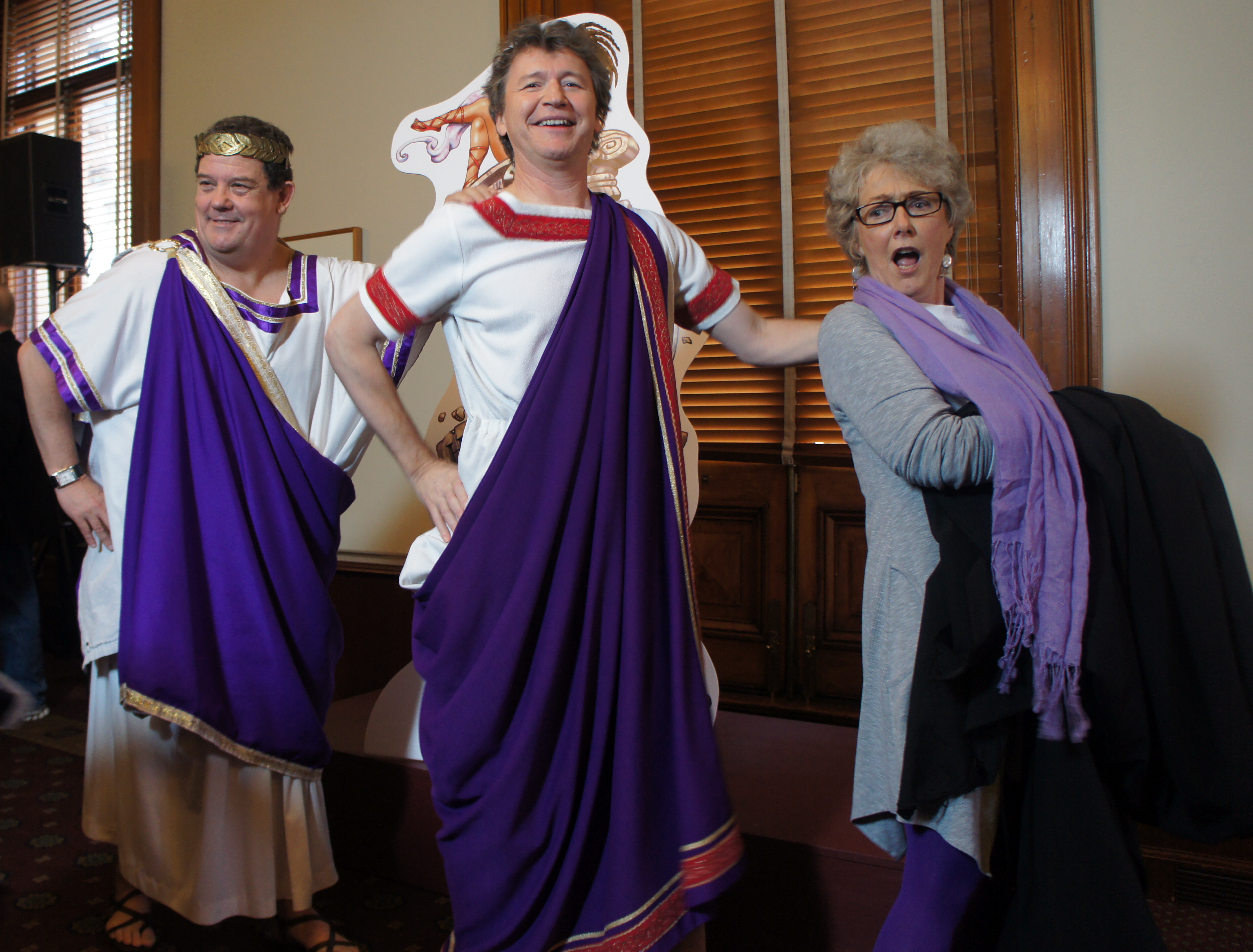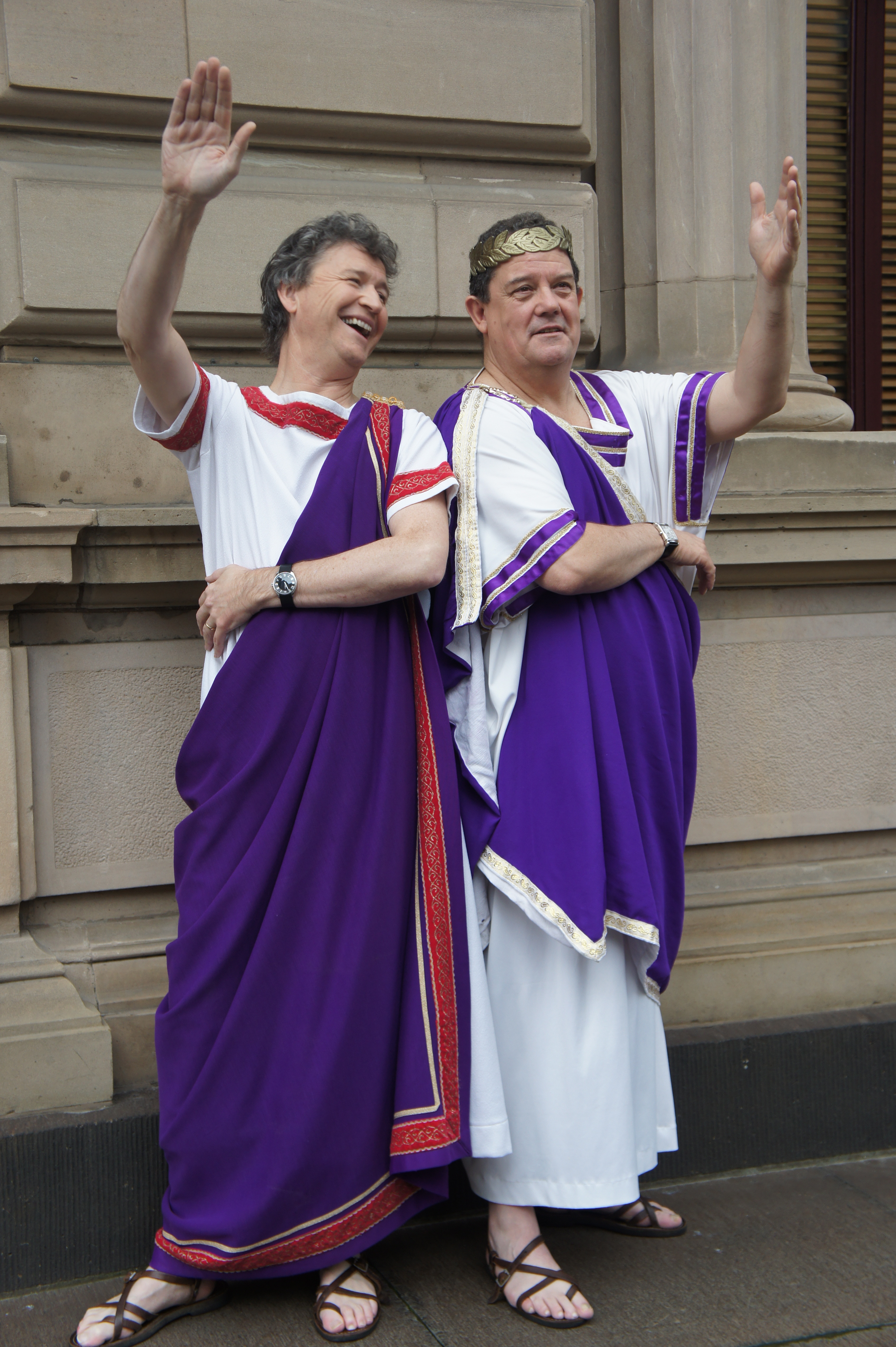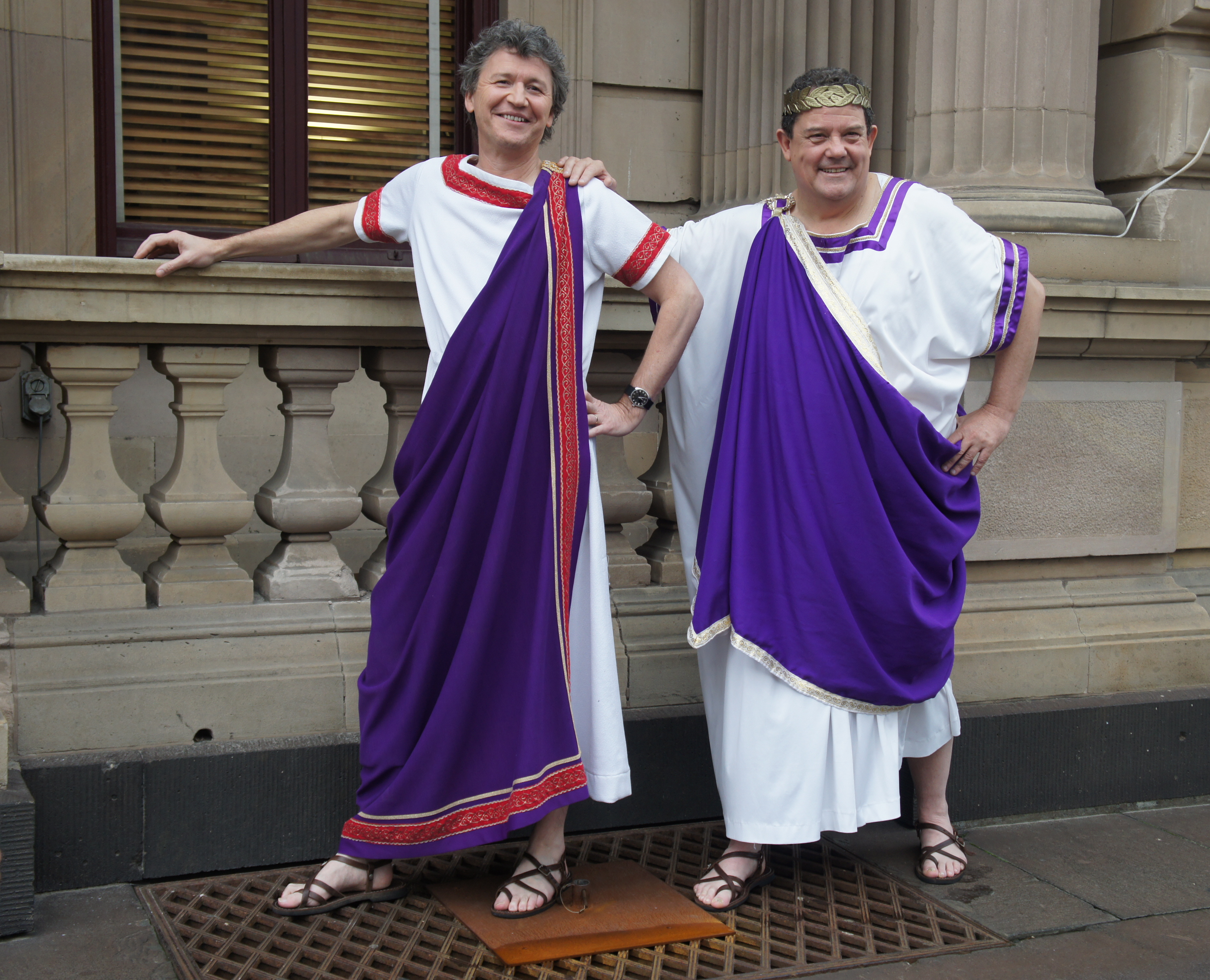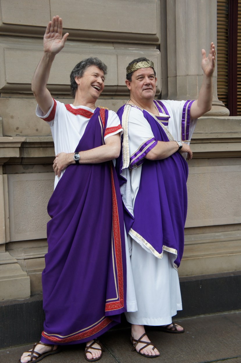 Frost and Phillips shared the spotlight at Melbourne’s Old Treasury House this morning to announce the show and share a few details about the exclusive Melbourne season. The merry, toga-clad pair described how the idea for the production came about, and the happy synergy of the availability of Geoffrey Rush and Her Majesty’s Theatre.