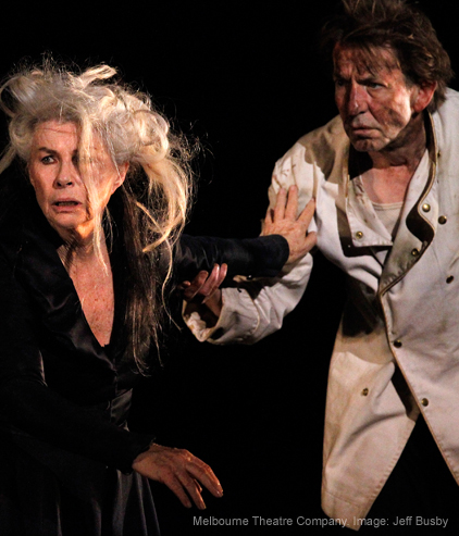And what a queen we have in living legend of the stage Robyn Nevin. An electric presence, Nevin commands the stage, conveying a complete physical characterisation of the challenging and highly coveted role. Beginning in regal blood red, her wardrobe and hair deteriorate with the queen’s loss of power and sanity. While it is difficult at times to tune the ear to all of Nevin’s speech, the strength of her acting shines through, creating a force that is felt throughout the play even when she is offstage.