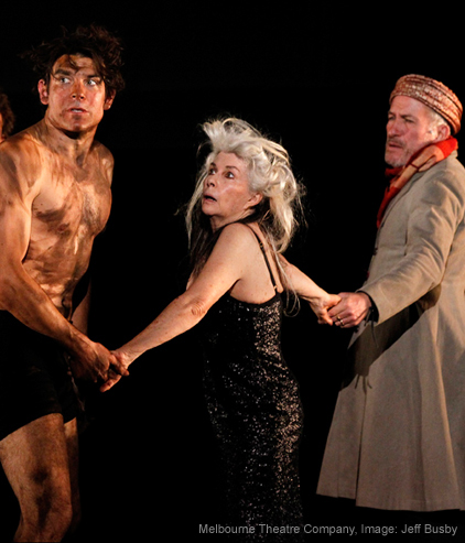 An economic company of only 10 plays the 16 or so characters and various supernumeraries. Speaking in natural, neutral accents, the company works as one to deliver the story in compelling style. Robert Menzies is of particular value as Kent, complementing his excellent delivery with an extra spark in his eye. Nicholas Hammond achieves two of the most distinct characterisations, as the odious Cornwall and the kindly doctor. Richard Piper’s gruff, expressive tones give Gloucester a natural, sympathetic countenance. MTC newcomer Rohan Nichol’s buff physique is an asset when Edgar roams the earth as mad Tom dressed only in brief black shorts. Nichol achieves a particularly natural delivery of the dialogue.