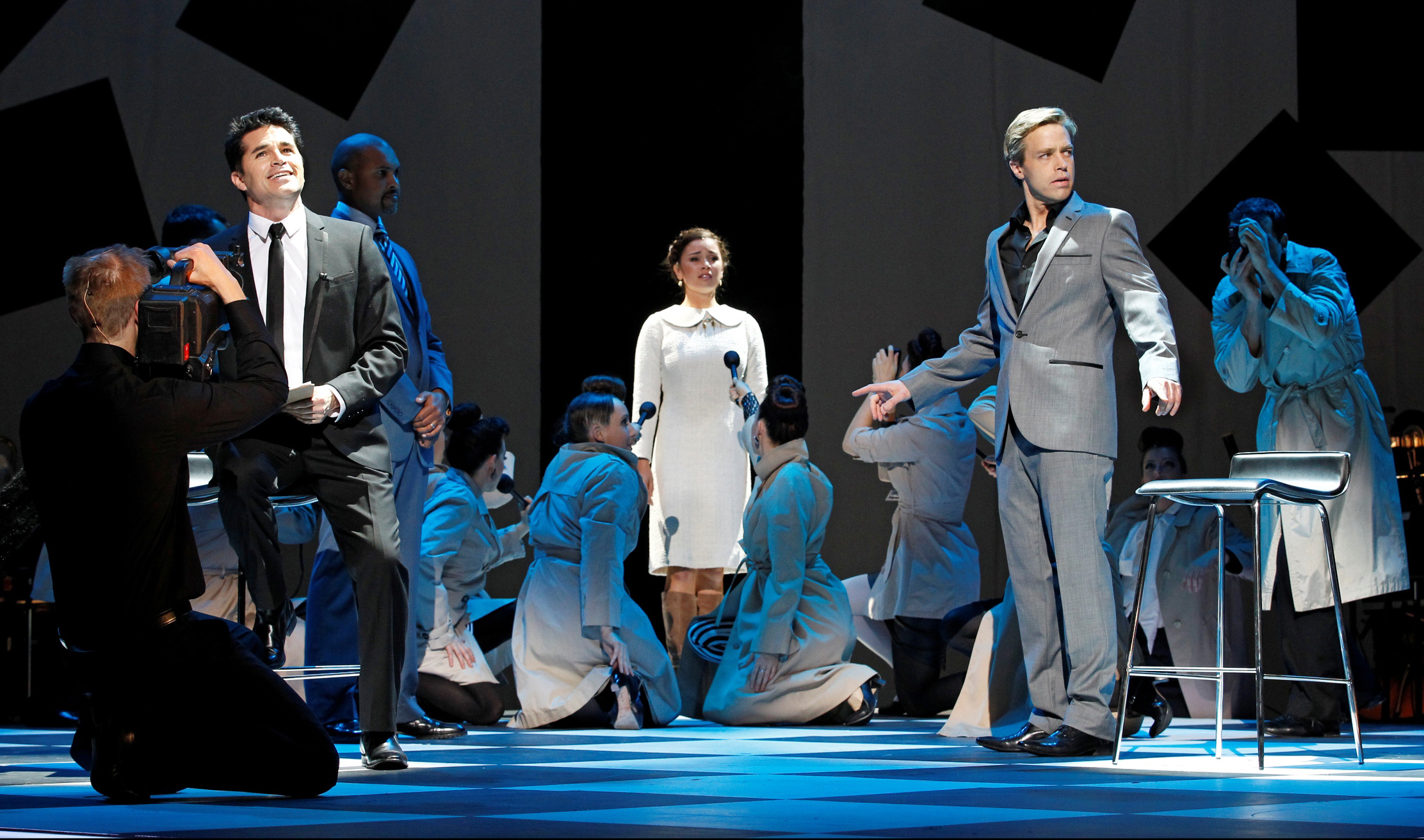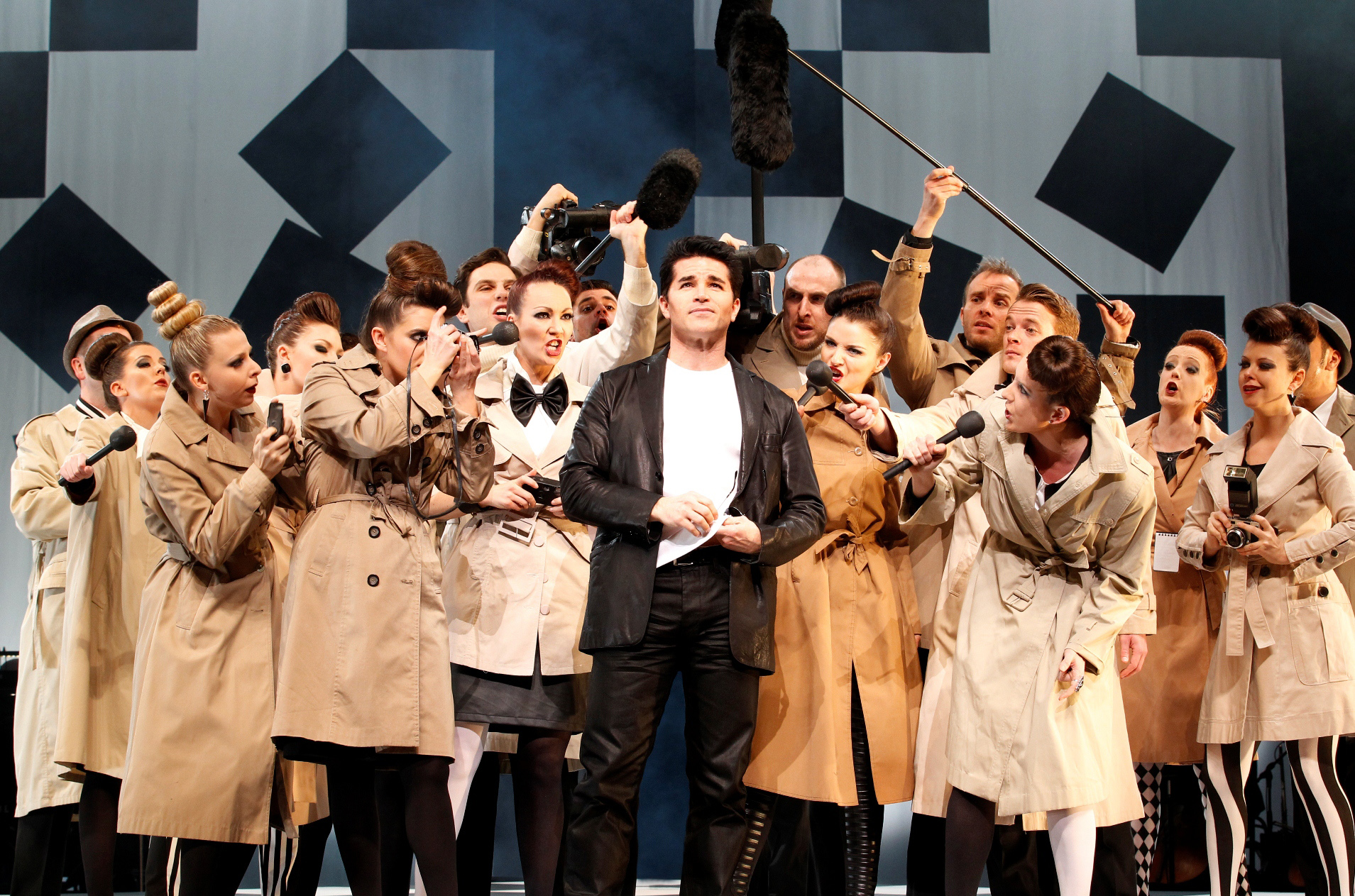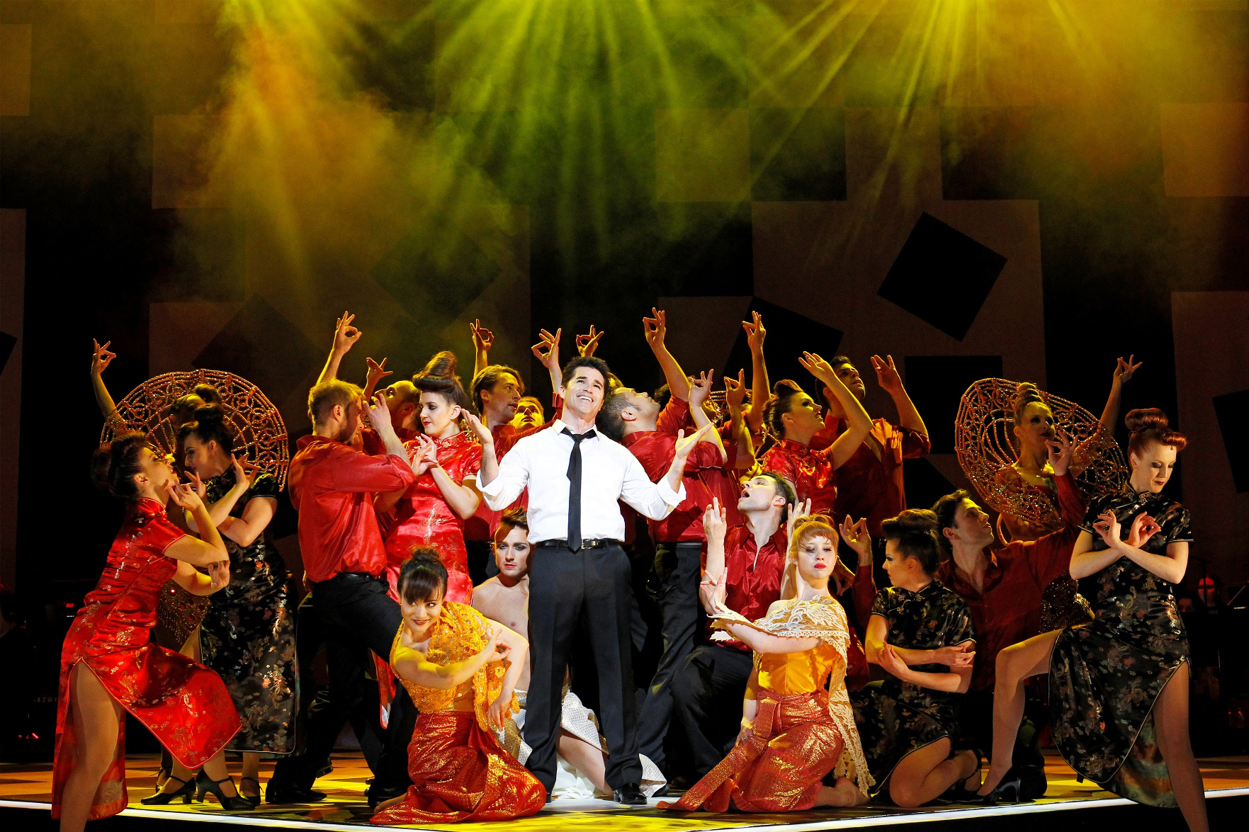 Shaun Gurton’s design has an epic feel, placing the action on a raked chessboard backed by massive banners and star cloth. Newcomer Krystal Giddings has designed dazzling black and white costumes, complemented by clever chess piece hairstyles from the female ensemble. Crisp choreography by Tony Bartuccio adds to the pageantry, as do a multitude of festively coloured props.