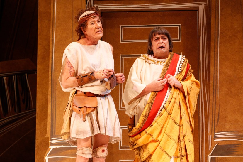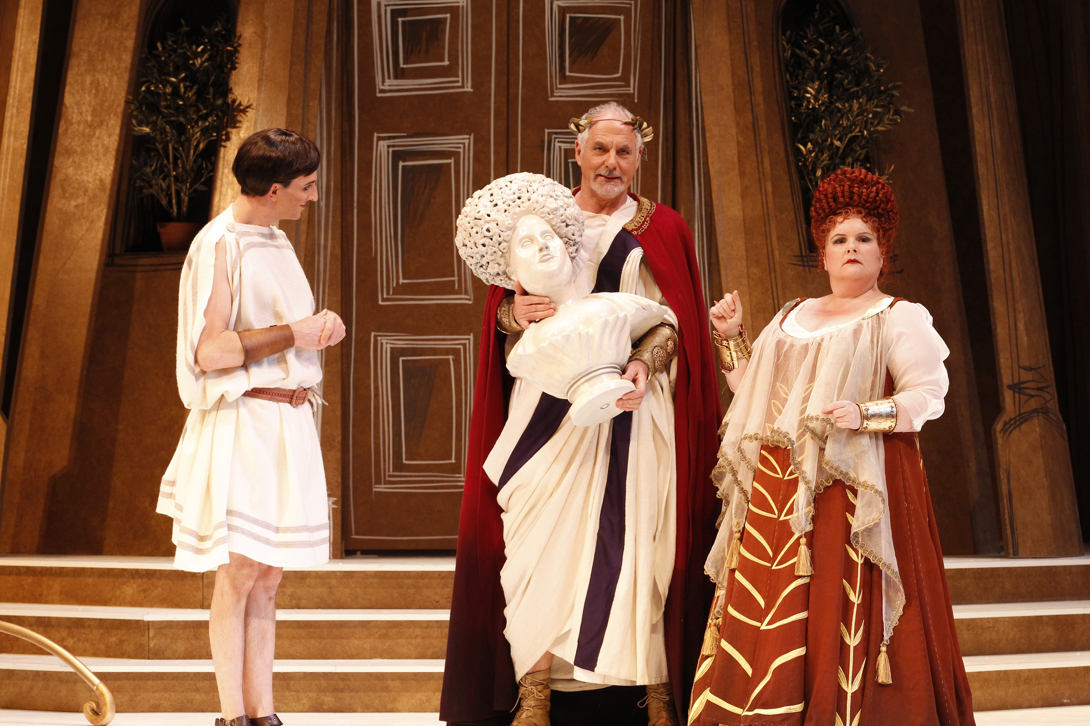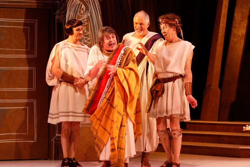 Magda Szubanski, another to reveal a talent for singing here, is a delight as the domineering Domina. Szubanski’s tendency to almost crack up, however, may be amusing in Kath & Kim blooper reels but really has no place on the professional stage. Shane Bourne, as Domina’s long-suffering patrician husband Senex, presents a likeable characterisation although he is let down at times by his broad Aussie accent.