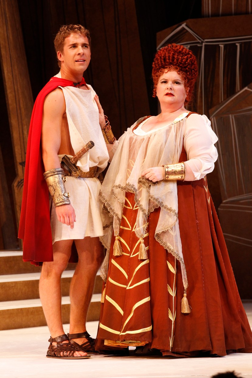 Melbourne’s sweetheart of the stage Christie Whelan succeeds in projecting the loveliness of virginal courtesan Philia. Her vague airheadedness, reminiscent of Dory in Finding Nemo, is a particularly endearing aspect of the comedy. Whelan makes a gorgeous pairing with the handsome Hero of Hugh Sheridan. A newcomer to the Phillips fold, Sheridan is revealed as a confident, appealing, highly talented stage performer. (Aficionados of fine male torsos will not want to blink during Sheridan’s brief towel clad appearance at the top of act two.)