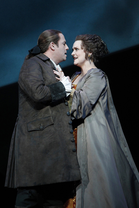 A highly impressive set of co-stars provide sterling support. Italian bass Giorgio Caodura glistens with delectable menace as Enrico, desperately manipulative brother of Lucia. Caodura’s pure, clear baritone thrills the audience, especially when joined by Matthews for Enrico and Lucia’s duets in act two. Talented Australian bass David Parkin heightens the role of chaplain and confidante Raimondo with a commanding presence, adding great authority to his singing. Rising tenor Stephen Smith shines brightly but all too briefly in the thankless role of the ill-fated Arturo. Young Artist Jonathan Abernathy sings the role of huntsman Normanno with ease, and displays composure in the extended sequences in which Doyle had Normanno the centre of focus on the stage.