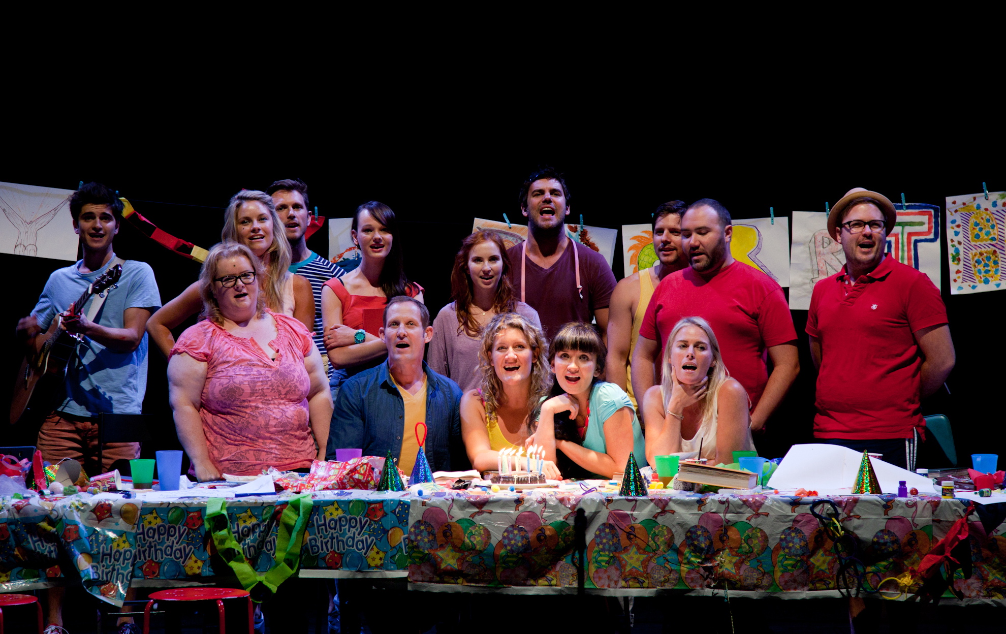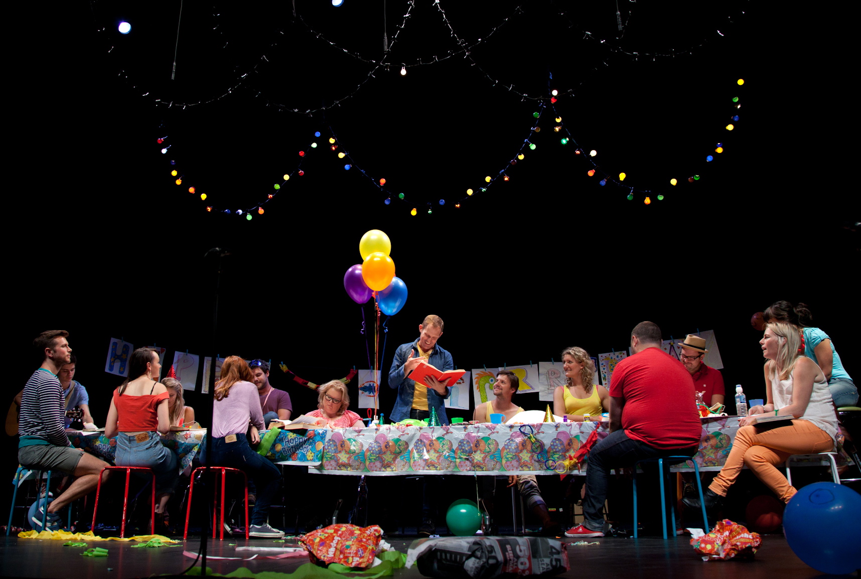 The festive children’s birthday party setting, designed by Owen Phillips, provides the ‘present’ of a book for each performer, which they can consult as they play their roles. Director Daniel Clarke further enhances the focus and dynamism of the piece by periodically including the music, games and hijinks of a party. The colourfully dressed partygoers are on stage throughout, having tactile fun making posters and paper chains. There is a totally engaging ebb and flow to the energy of the performance, which, in far lesser hands, could have become monotonous quite quickly. Clarke’s achievement with the direction is all the more impressive given that the full cast gathered for the first time only a few days before this official opening night. Line cues, in particular, are very tight.