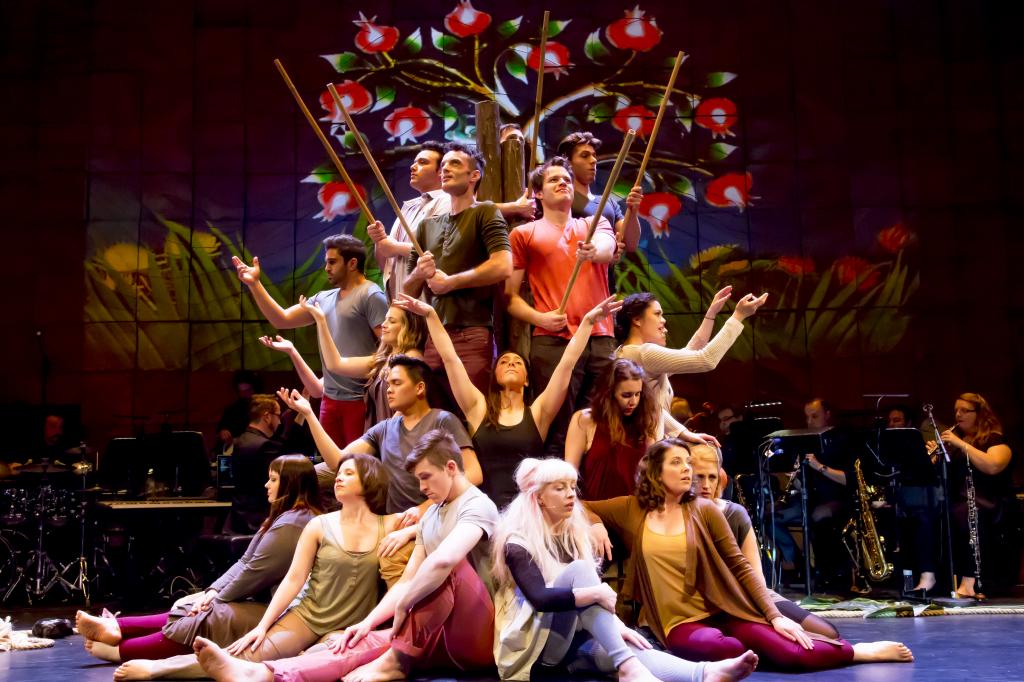 Despite the potential in a one-night concert for more performers, Joyner maintained the double casting of key roles, a concept that creates a clever symmetry between the two acts as we move through the old testament from Adam and Eve to Noah’s Ark. The actors playing Adam and Eve name the animals, and then those same performers welcome the animals aboard the ark. The actor playing badass brother Cain later plays a son of Noah facing the dilemma of loving a woman cursed with the mark of Cain.