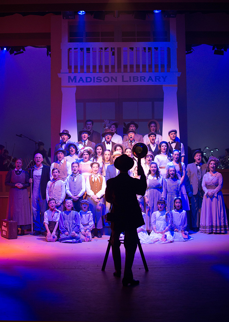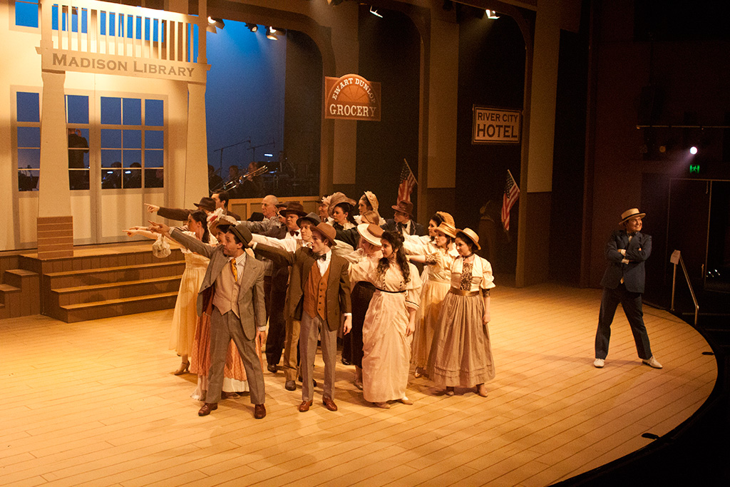 The curved stage and auditorium of the Geoffrey McComas Theatre creates an intimate connection between audience and cast together to share an immersive visit to parochial hamlet River City, Iowa. Even with band in full view upstage, the stage space is expansive, providing ample room for the wonderful full company song and dance numbers dotted throughout the show.