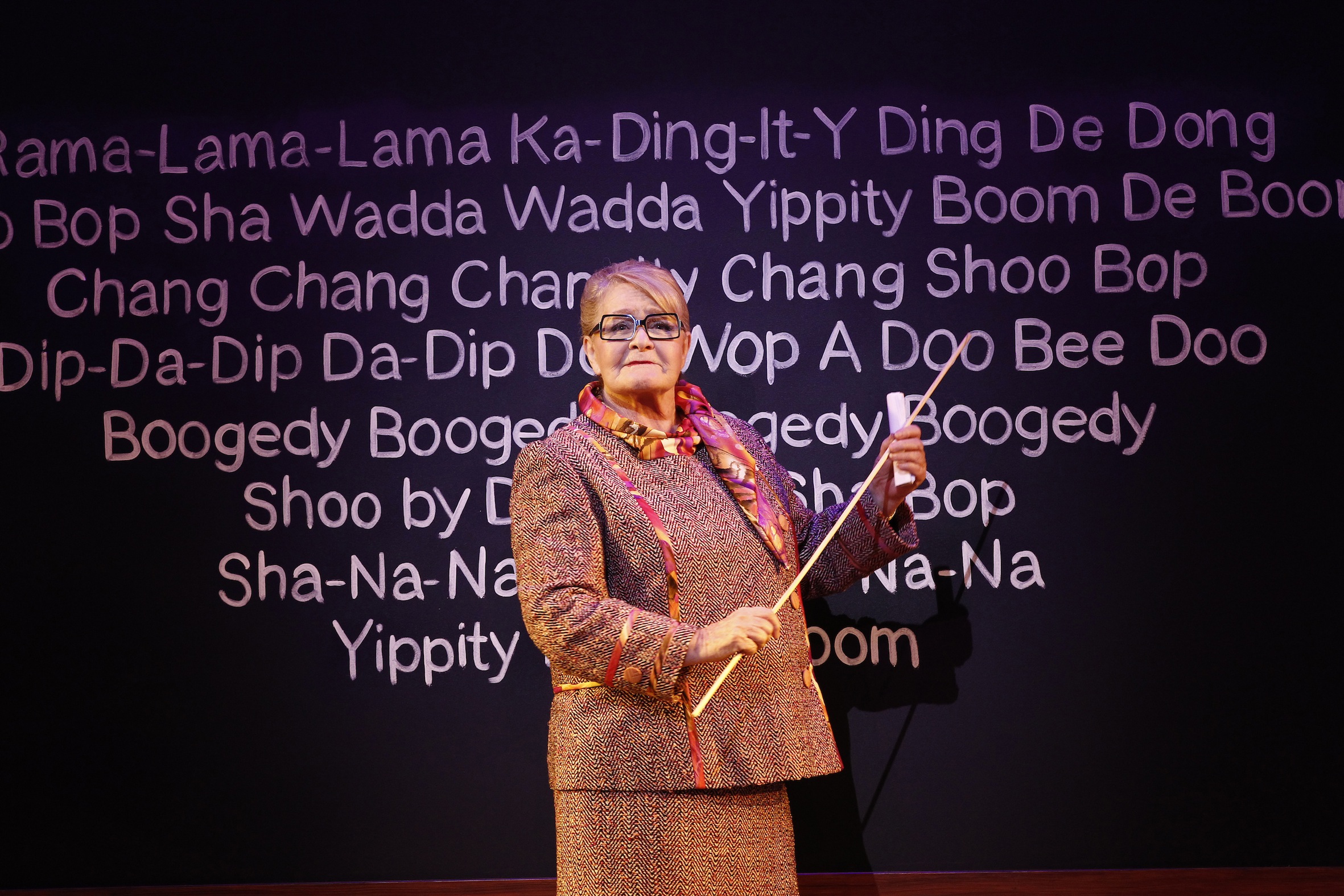Promoted as the Number One Party Musical, the festivities kick off in the Sydney Lyric foyer, decked out in Rydell bunting and life-size cardboard cast pictures for photo opportunities. Pink drinks and themed treats are for sale at the recently enlarged foyer bars. The fun starts in the auditorium before curtain with Bert Newton back to his roots in the radio booth as DJ Vince Fontaine. Our Miss Lynch, played by 1980s soap icon Val Lehman, runs some 1950s-style karaoke audience warm up, with requisite Prisoner reference thrown in for diehard Wentworth tragics like me**.