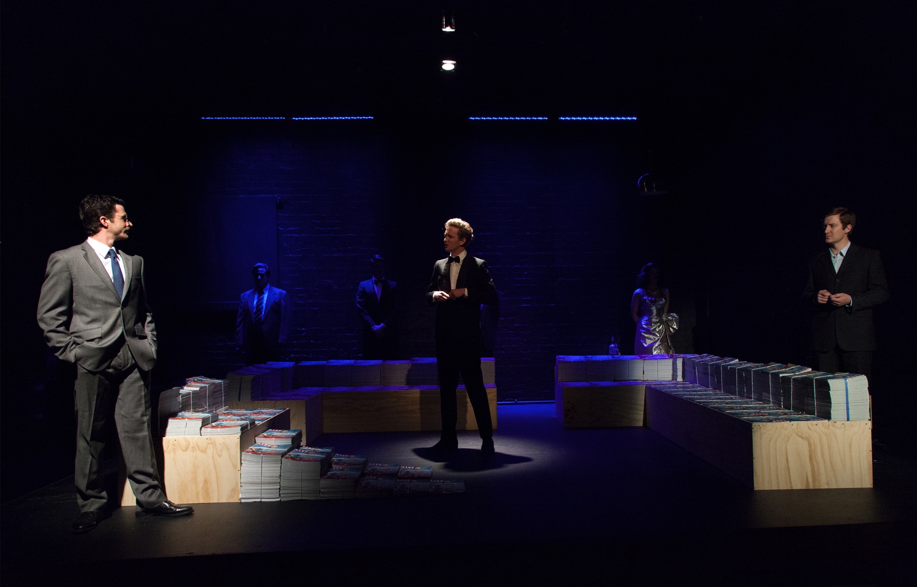 Ryan Foote’s design houses the action in a multi-purpose room of wooden benches, papered with umpteen copies of Rock Hudson on the cover of Life magazine, an effective symbol of the omnipresent impact of image and its symbiotic connection with the media. With the full cast of seven actors on stage for most of the play, Clare Springett’s lighting is most effective in bringing the characters in and out of focus as the action moves from the past to the present, and from the real to the surreal.