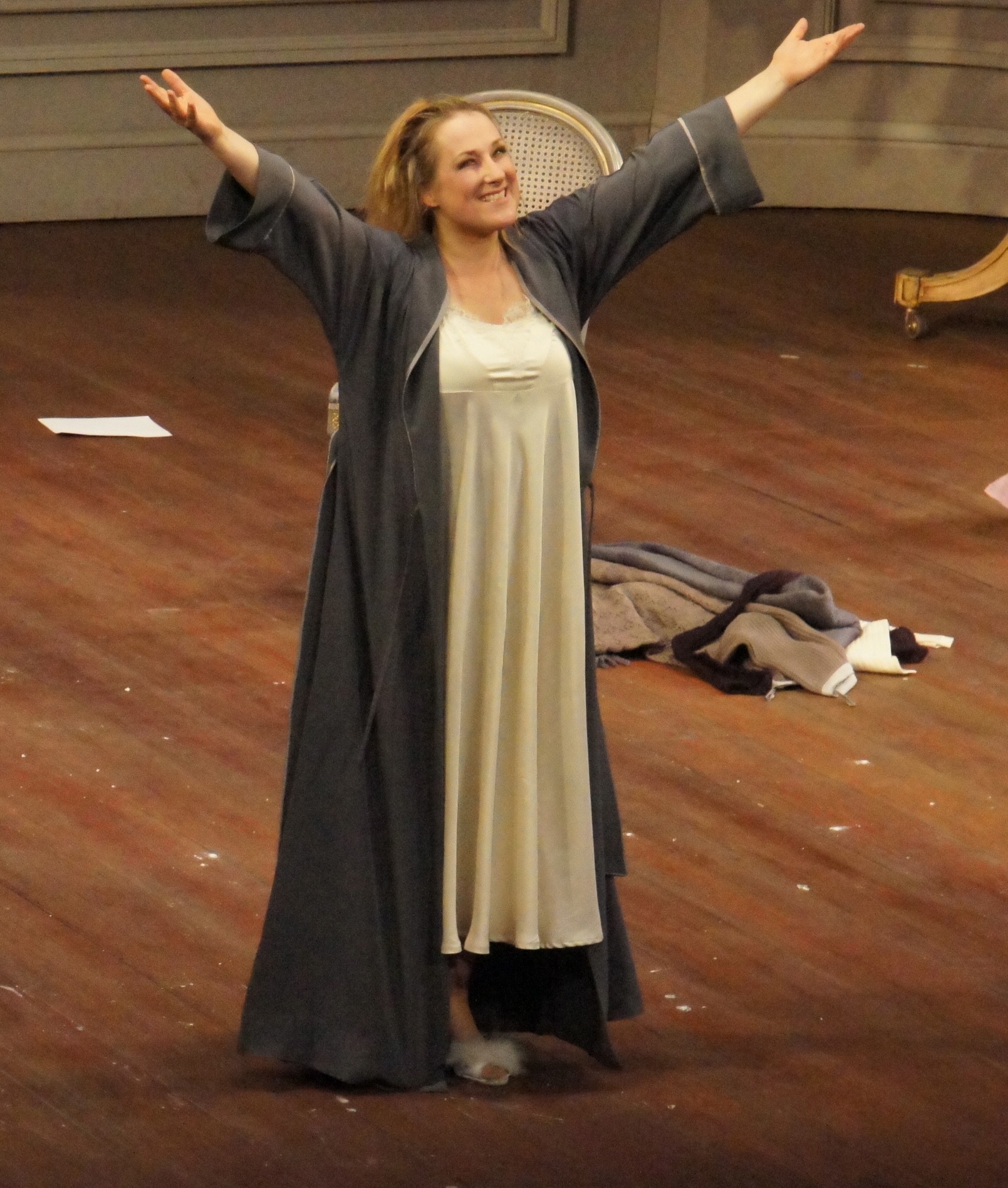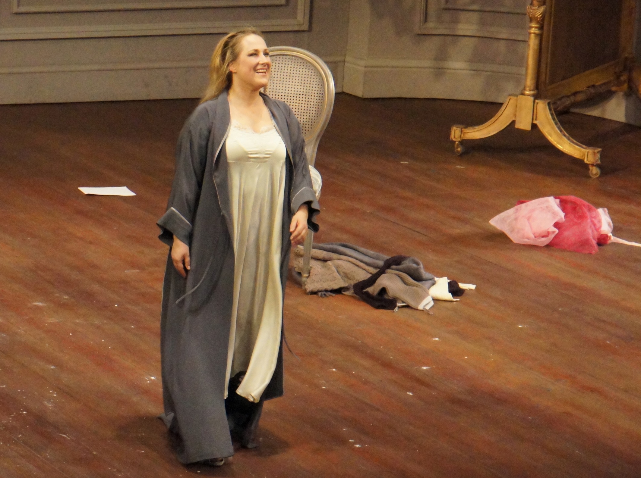 After a pause, we are back in the original salon set, with Violetta’s deathbed being a lone eiderdown quilt on the floor. Damrau’s incredible singing of “Addio del passato,”which ends in the most impossibly delicate final note as she cocoons herself in the quilt on the floor, absolutely brings down the house.