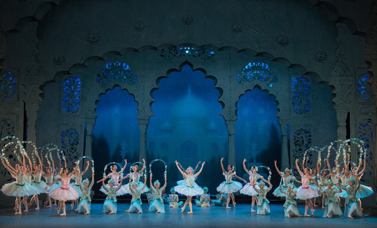Act three sees a surprising number of full-scale scenes. Bob Ringwood’s design, for both sets and costumes, is utterly lavish, and features an infinite amount of sparkle and lustre. As the Pasha dreams of his harem, we see the full female corps in crisp white tutus trimmed with the palest mint green. Pasha’s slave girl Gulnare and three others are the “roses” in this garden scene, their tutus trimmed in pale pink.