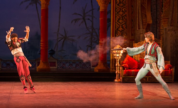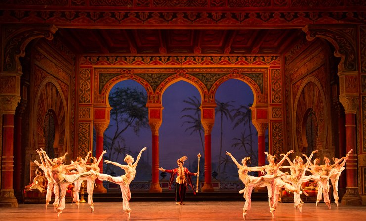 Act two sees the lovers, and entourage, arrive in a grand, golden pirate cave, which looks out over a serene moonlit bay. Celebrating their escape, Medora (Lauretta Summerscales), Conrad (Arionel Vargas), and his devoted slave Ali (Zdenek Konvalina) engage in a series of increasingly thrilling solos in a pas d’action of dances that follow each other in increasingly rapid succession. This is a virtuosic, highly athletic sequence, which is greatly appreciated by the crowd.