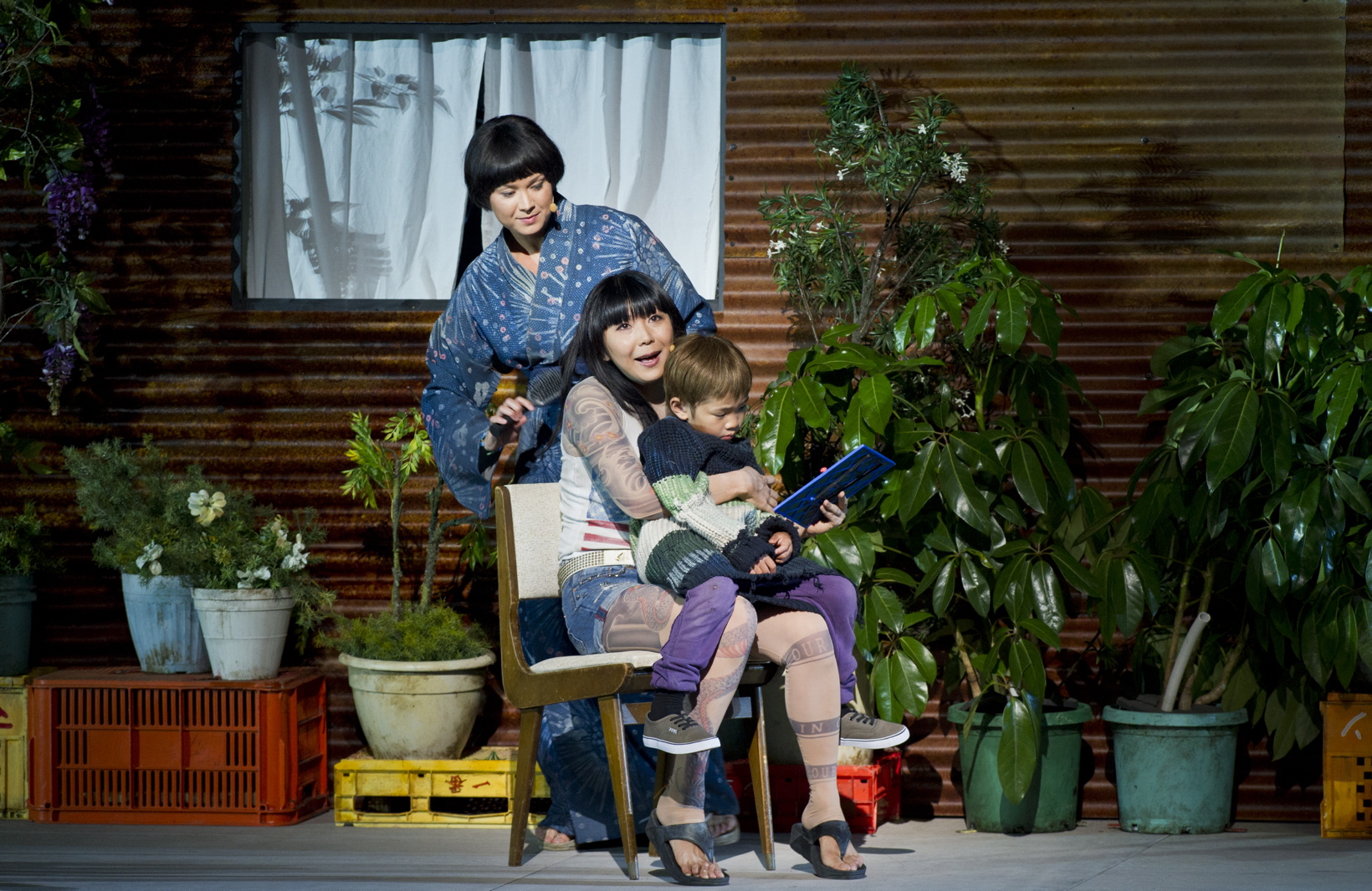 Goro is likewise altered from marriage broker to architect, with the opening text about the flexible floor plan of Butterfly and Pinkerton’s home centred around blueprints and land plots chalked onto the green hill. In a spectacular scene change, which is worth watching during the interval, the concept is fully realised with the three-year jump forward in time. Gone are the bamboo trees, grass and fireflies, but gone too are the developers. The project abandoned, perhaps due to the global financial crisis, the quarter-completed project is now a slum, housing transients rather than the glamorous residents that would once have been envisioned. In a poignant sequence in act two, these displaced people are moved on, in a depressing parade of humanity, during the gorgeous “Humming Chorus.”