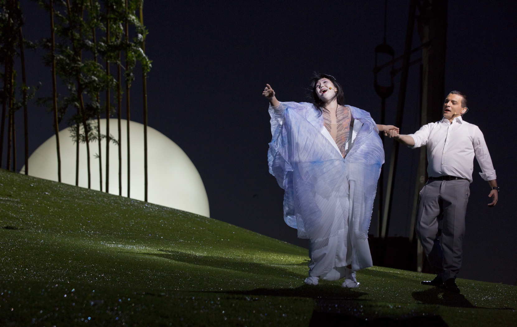 With all this talk of updated action, purists may at this point be turning up their noses in disdain. Remarkably, though, the present day setting retains more than a healthy amount of traditional elements. Housing development aside, the storyline and characters are unaltered, with no compromise or suspension of belief required for the update to work. Best of all, if this project is designed to expose more people to opera, this production succeeds completely in placing the focus clearly on the opera and the singers, with technical wizardry used to complement the action rather than divert attention. A measure of success in a staging like this is: does it achieve what could not have been achieved in an indoor, proscenium arch production? The answer here is a resound yes, with cranes, car, speedboat, fireworks and stadium-sized stage at times allowing so much simultaneous action that it is difficult to absorb it all in one viewing.