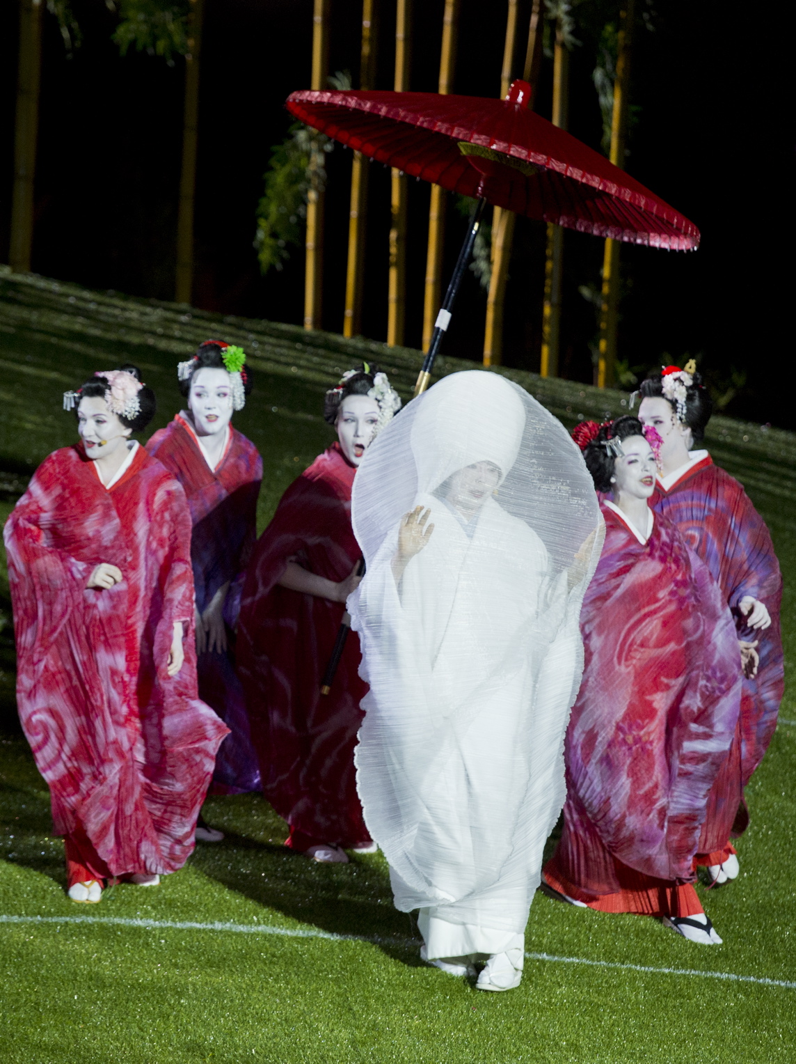 Lluc Castell’s costumes feature some exquisite Japanese designs, and the society wedding outfits are humourously gauche. Alexander Koppelmann’s lighting is exceptional, painting the set in warm glows and dappled shadows, and drawing the eye to point of focus on the massive canvas. Sound designer Tony David Cray keeps the volume level a little too high at times, but nonetheless achieves miracles with the outdoor location, presenting a solid range of colour from the orchestra and reproducing the voices with clarity. Special mention for the fact that the high winds on opening night were not picked up at all by the singers’ microphones.