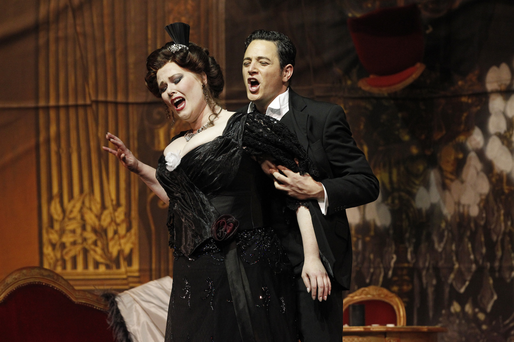 From the moment she first opens her mouth to sing, Jessica Pratt makes it clear why we are all here. Pouring forth like liquid gold, Pratt’s natural, effortless soprano has the audience entranced with its beauty and dexterity. Each of Violetta’s moods and styles are no problem for Pratt; from soaring cadenzas to breathless pianissimo, she has the audience’s rapt attention at all times. While Pratt may appear a little healthy to be a dying consumptive, she is suitably pasty and disheveled at the end; meanwhile, her buxom beauty makes her popularity as a courtesan clear. Pratt particularly impresses in Violetta’s big act one tour de force sequence of “É strano,” “Ah! Fors’è lui” and Sempre libera,” earning a rousing, extended ovation at the end of the act. The way her voice exquisitely caresses the phrases in “Ah! fors’è lui” is sublime.