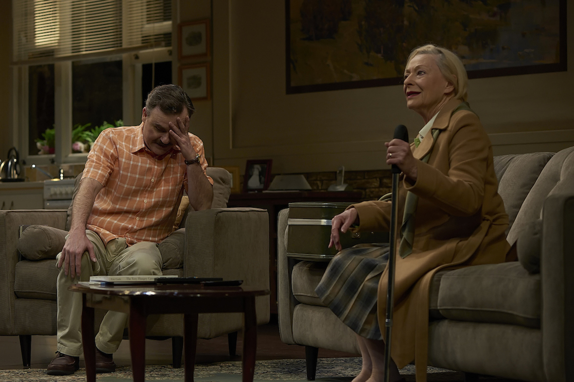 A clever touch to cover scene changes is the use of pre-filmed skype sessions between Maggie and her begrudgingly polite grandchildren. The chat that descends into a shoving, biting fight is a cracker. Although the thought of technology-challenged Maggie initiating a skype chat is a bit of a stretch, the prospect of Arthur setting up the calls to give himself a little break makes total sense. Pre-recorded phone calls are also used for some scene breaks, but these tend to run out of steam as the night progresses.