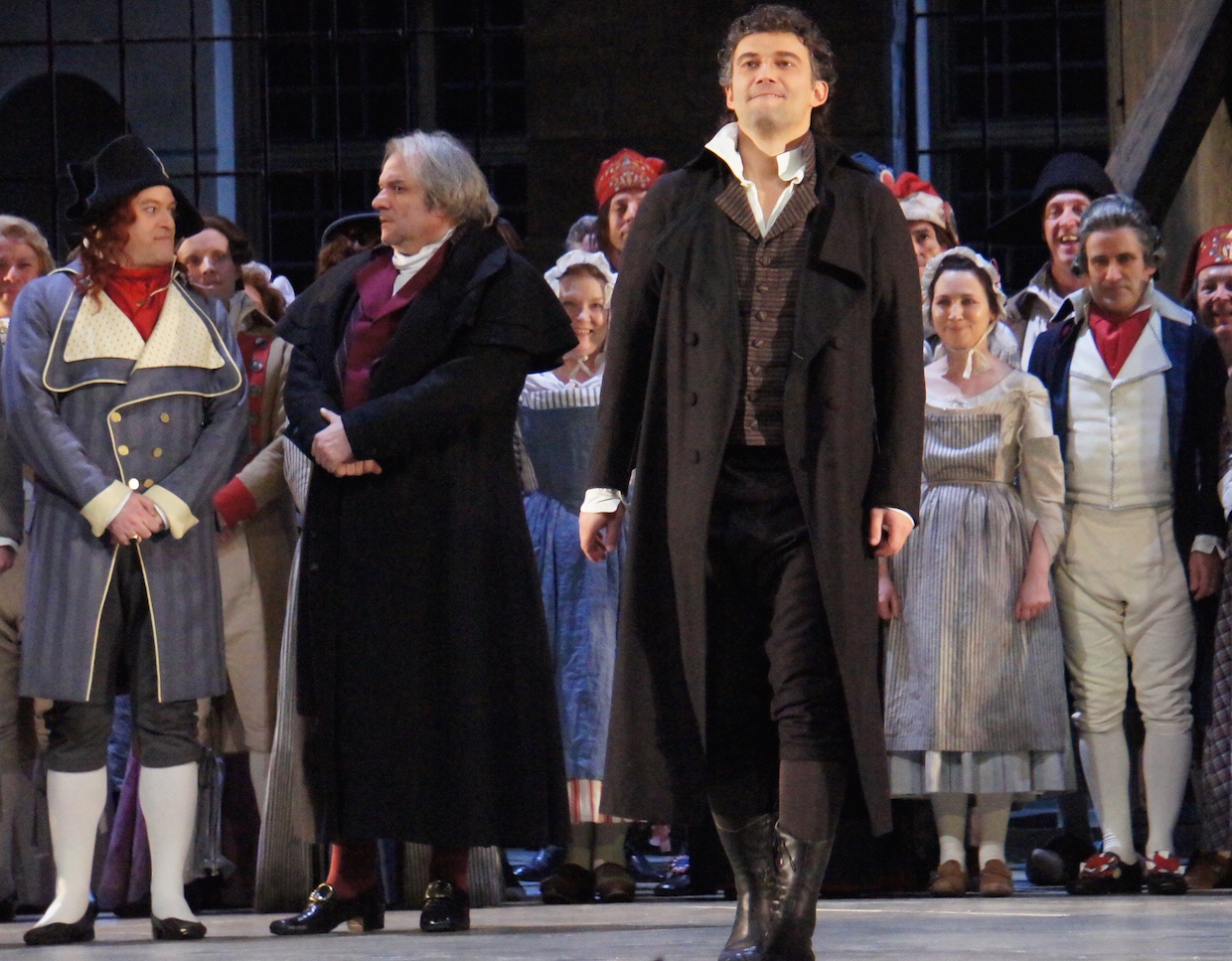 His luxurious tenor in absolutely superb form, Kaufmann gives a highly memorable performance as the titular poet, a man unwittingly swept into a charged political arena. McVicar highlights Chénier’s position as an observer by having him downstage through the frivolous festivities of act one, perhaps indicating that the sensitive poet is aware that the party will be over all too soon. Looking every bit the dreamy romantic lead, with thick curly hair and glossy dark frockcoats, Kaufmann immerses himself in the role with quietly focused (rather than showy) acting.