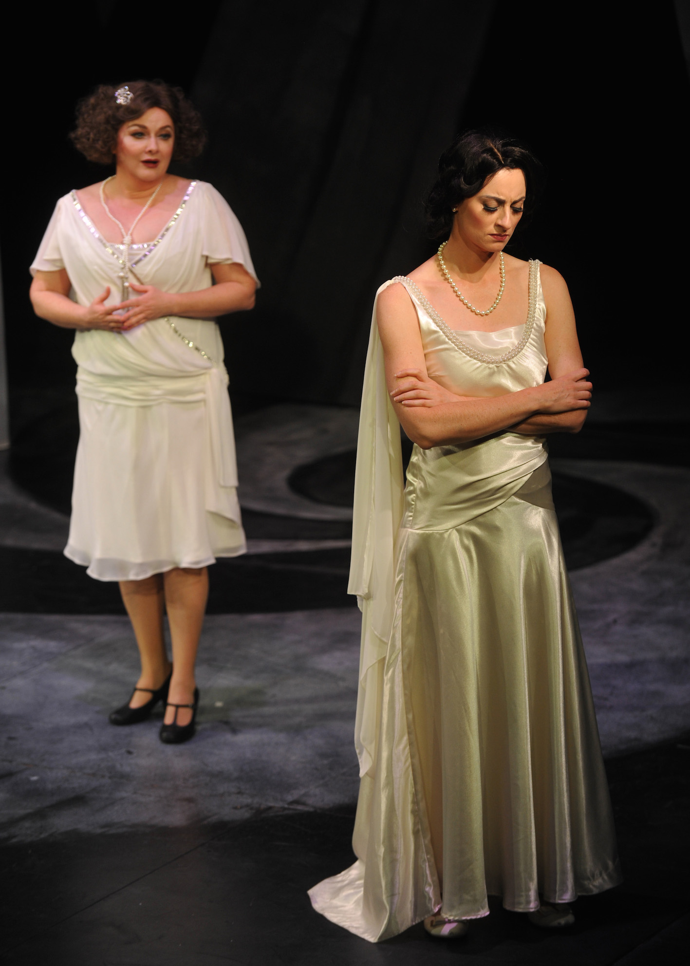 Set designer Christina Logan-Bell and costume designer Daniel Harvey have clearly worked together closely with Chaundy to create a unified vision of shadowy terror. Logan-Bell’s designs contrast churning spirals and sharp peaks, with the black, white and grey palette completely reflected in Harvey’s costumes. Set construction, by Greg Carroll, is impressively solid. The costumes, although looking very effective as a whole, suffer somewhat from budget constraints, meaning that there is a range of styles and periods on show (for example, the three bridesmaids do not match each other).