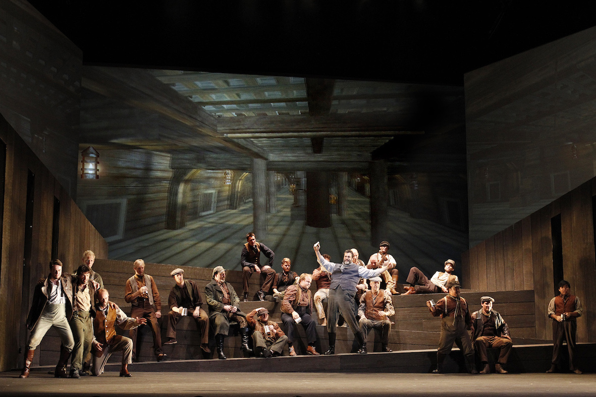 Teresa Negroponte takes a realistic yet highly decorative approach with the costumes, contrasting the uniform browns of the men with a rainbow of muted pastels for the women. Daland’s daughter Senta wears a gown of virginal pale blue, while her nurse Mary stands out in rather decadent purple. The level of detail extends to the women’s hairstyles, and their bonnets, when visiting the dock, are a delightful touch.