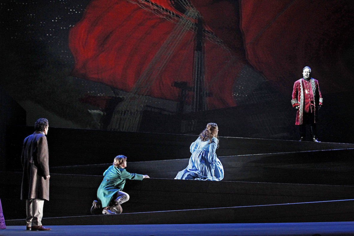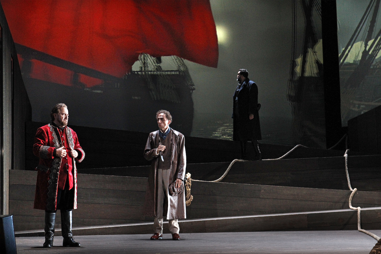On a stormy sea, Captain Daland’s vessel pulls into port, followed shortly after by the ghost ship, its massive red sails billowing precariously in the storm. 3D glasses can be rested for most of act two, set in Daland’s home, before the final sections return to the harbour for a visit below deck and the magical apparition of the ghost ship’s crew.
