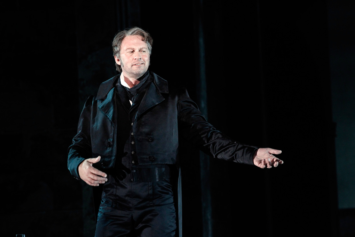 Robert Jones’ epic stage design, seen first in the smaller Joan Sutherland Theatre last year, looks just as grandly impressive in the State Theatre. Chalky black and grey marble columns and walls soar to great heights overhead, with an ongoing array of sliding and flying set pieces creating a seamless flow between scenes. A patch of blue sky behind a graveyard is the only flash of colour for the evening in this richly textured, grayscale design. The centrepiece of the staging is a seemingly endless staircase, which slowly, and very satisfyingly, lowers into place.
