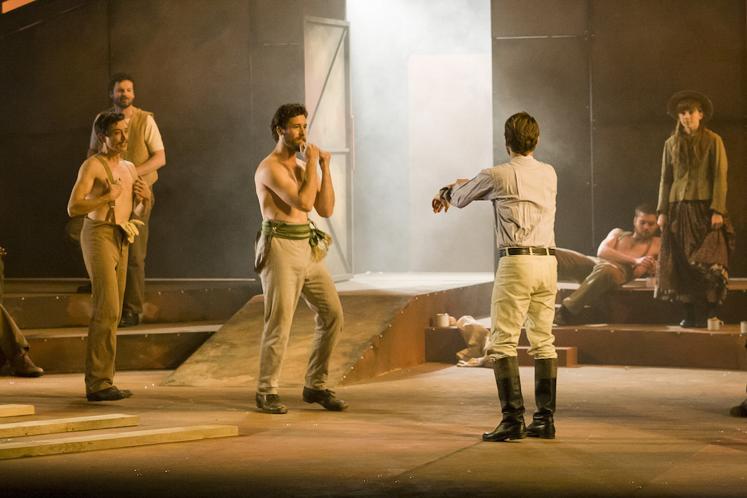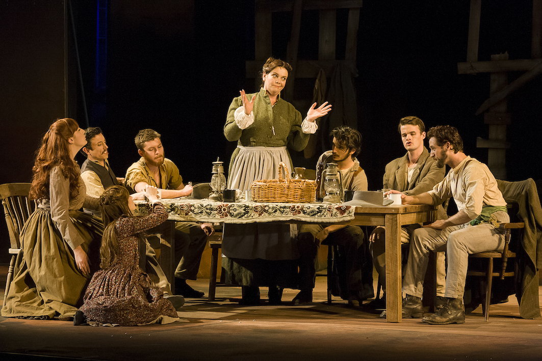 Lyons’ deft skill is evident in numbers such as “Here’s To The Kellys,” which is ostensibly a joyous family ditty but also serves to fill in backstory that Ned has missed while in jail for three years. “Sing! Dance! Drink! Love!” is a joyous celebration at the inn, yet also sows the seeds for Constable Fitzpatrick’s smutty obsession with young Kate Kelly. Orchestrations for male ensemble number “Timber and Steel” capture the metallic clang of working on the railroad, and provide an opportunity for some energetic choreography from Michael Ralph.