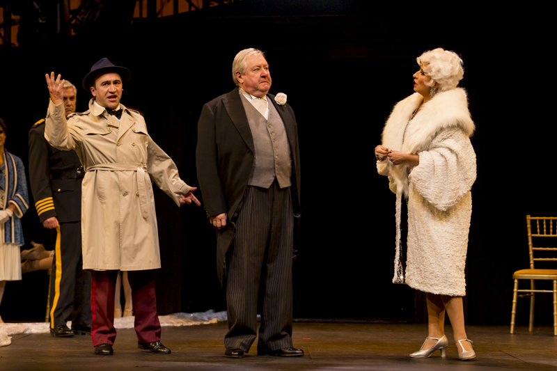 Costume designer Isaac Lummis has really hit his strides with Nice Work If You Can Get It, designing with confidence, vision, flair and wit. Highlights include, but are certainly not limited to, the scanty chorine outfits for the opening speakeasy scene, the chorus girls’ gorgeous blue and white outfits and Mother’s shimmering black and silver getup beneath her luxurious white fur.