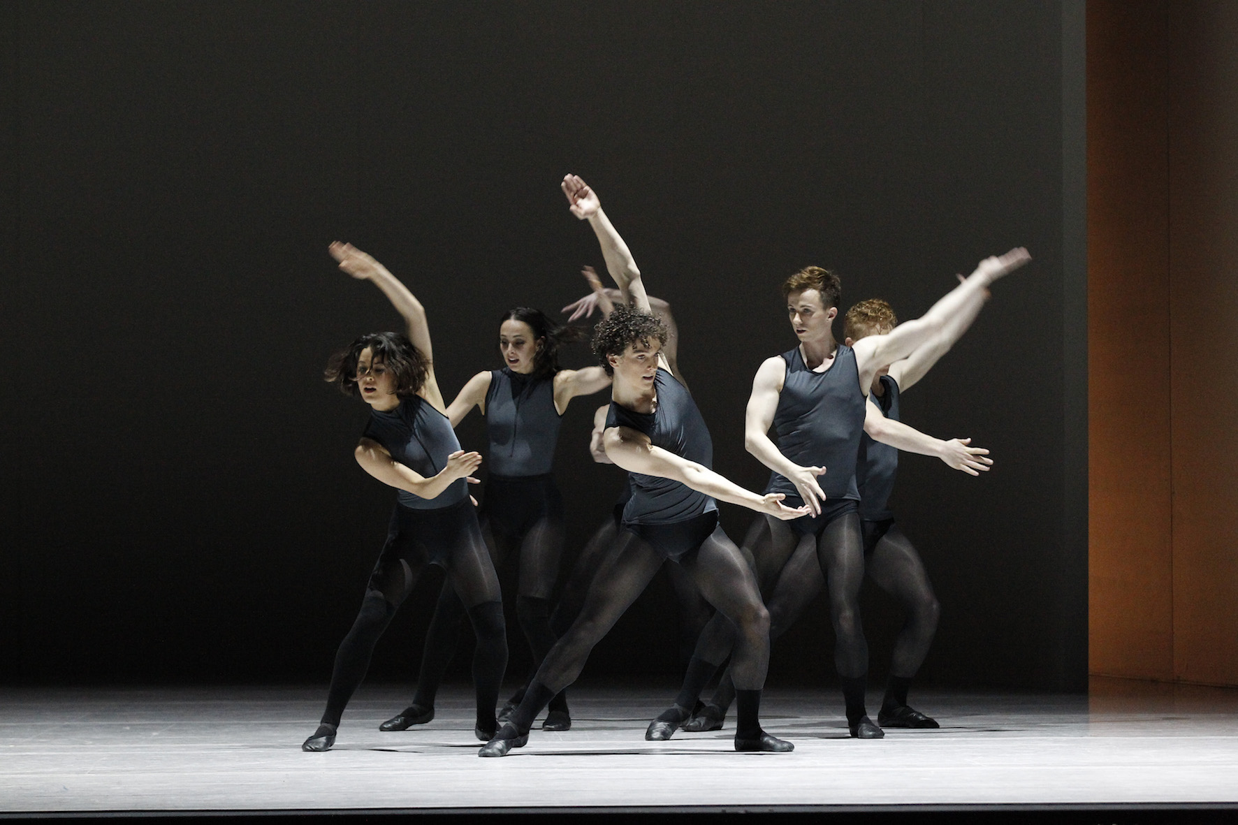Dressed in masculine steely grey singlets and sheer black stockings, there is an androgynous look to the dozen dancers in the piece. The sheer white curved wall of Kelvin Ho’s scenic design picks up the highly dramatic effects of Benjamin Cisterne’s lighting. Beginning from an inky blackout, and at one point bathing the stage in a golden glow, the lighting is a significant and affecting aspect of the design.
