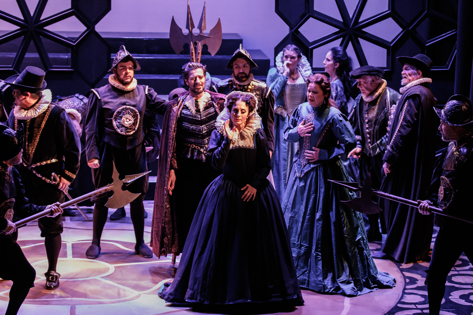 Enhancing this scenic design, the company has been extremely fortunate to secure the use of a stunning set of costumes, designed by Jennie Tate and owned by Opera Australia. The chorus progress from festive emerald greens and purples to dark cloaks and hoods from the dramatic final scene. The lead men sport smart pantaloons, velvet vests and fetching headwear, but the most eye-popping costumes are reserved for the queens, particularly Elizabeth. Mary’s main gown is a clever mix of electric blue satin covered with fine dark black lace. For the final scene, she appears without bustle, making her look all the more vulnerable and exposed. The final onstage change to fiery red for her execution has tremendous impact.