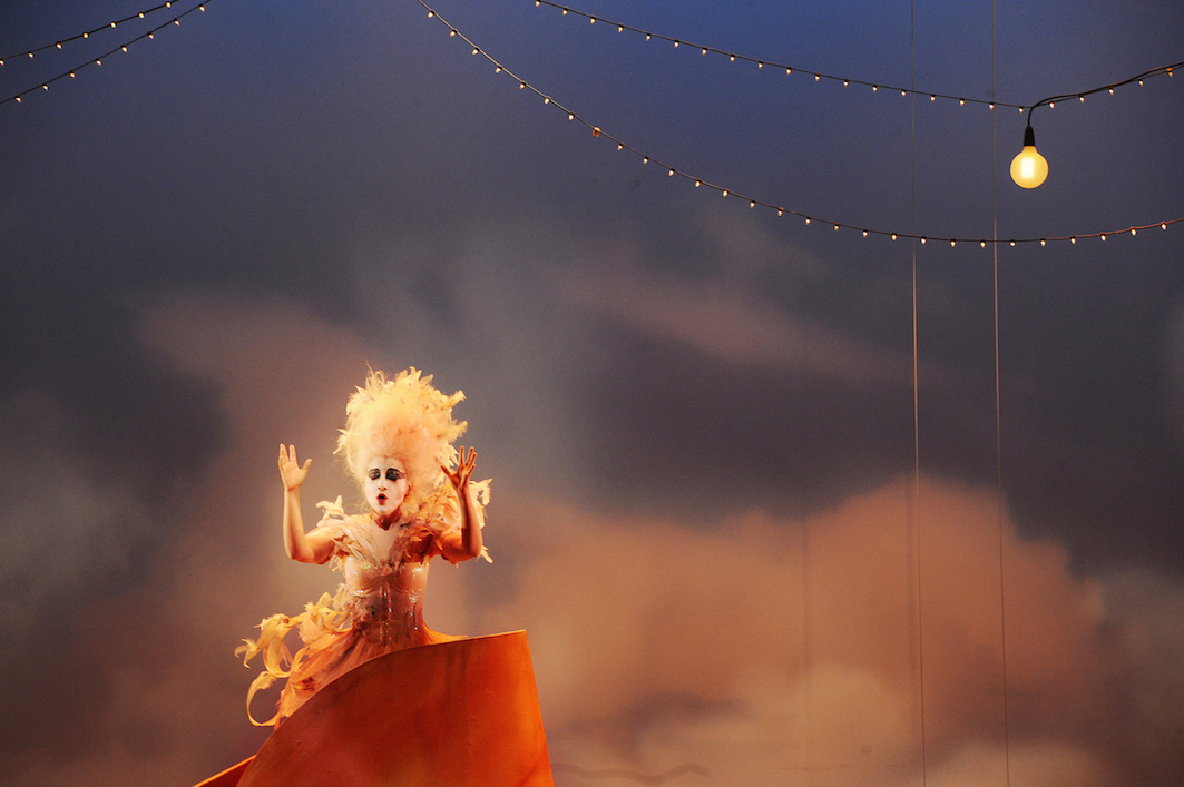 Kate Miller-Heidke has written a rich, eclectic score that surely warrants repeat listenings. Also a member of the cast, Miller-Heidke plays the fluffily coiffured Bird, our guide and host for the evening. Perched high upon a spiralling Pride Rock-type cliff face, Miller-Heidke’s Bird connects the piece to the regular world of opera with a diva-like opening sequence that seems to contain the briefest snatches of the Queen of the Night aria.