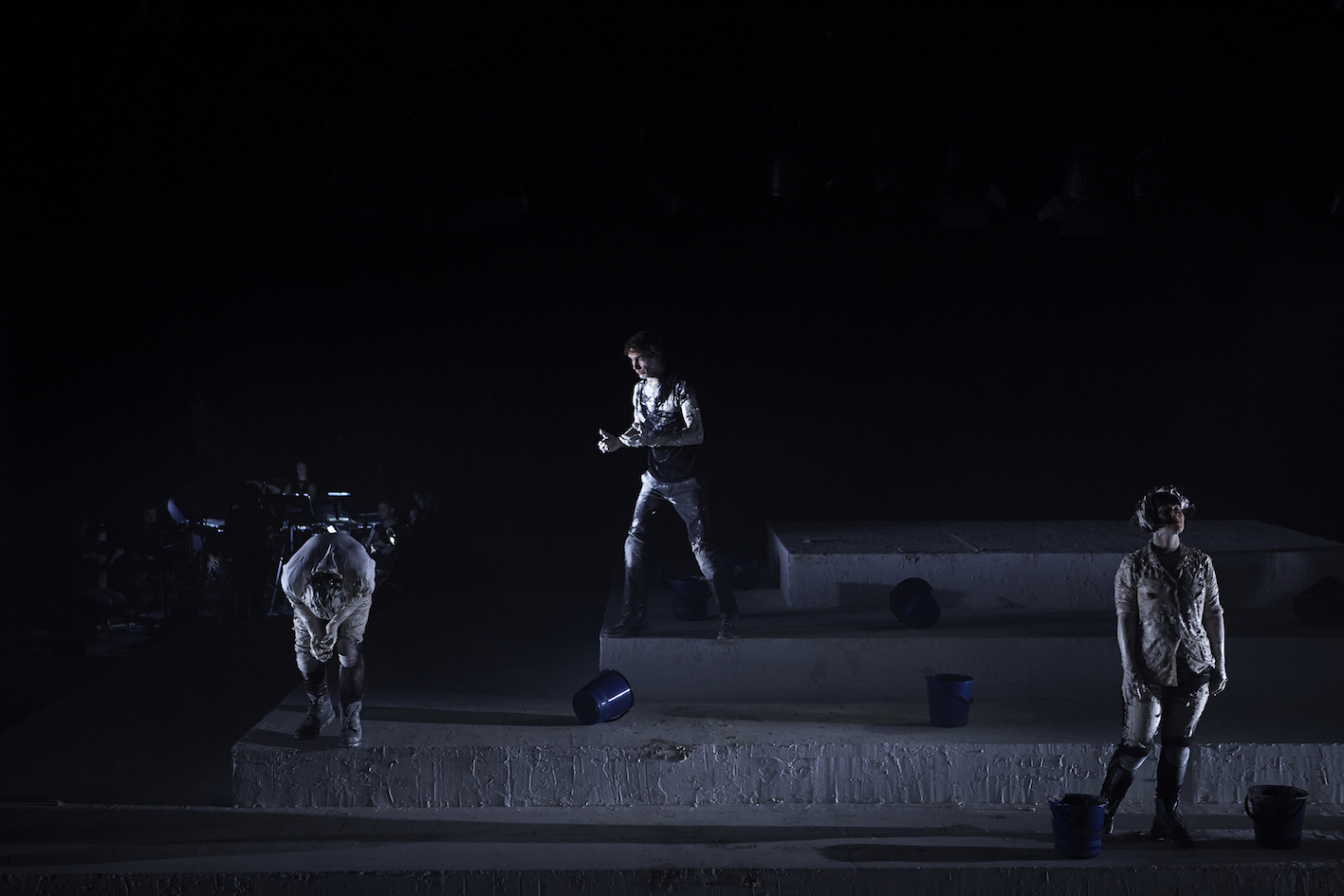 Elizabeth Gadsby’s sparse design is incredibly effective in fluidly portraying time and place. A series of white platforms rise, pyramid-like, in the open space. In close alignment with the non-literal playing style, Gadsby’s costumes are neutral, modern daywear. A large collection of blue plastic buckets is used to dig the trenches and, later, to represent the multitude of graves of the fallen.