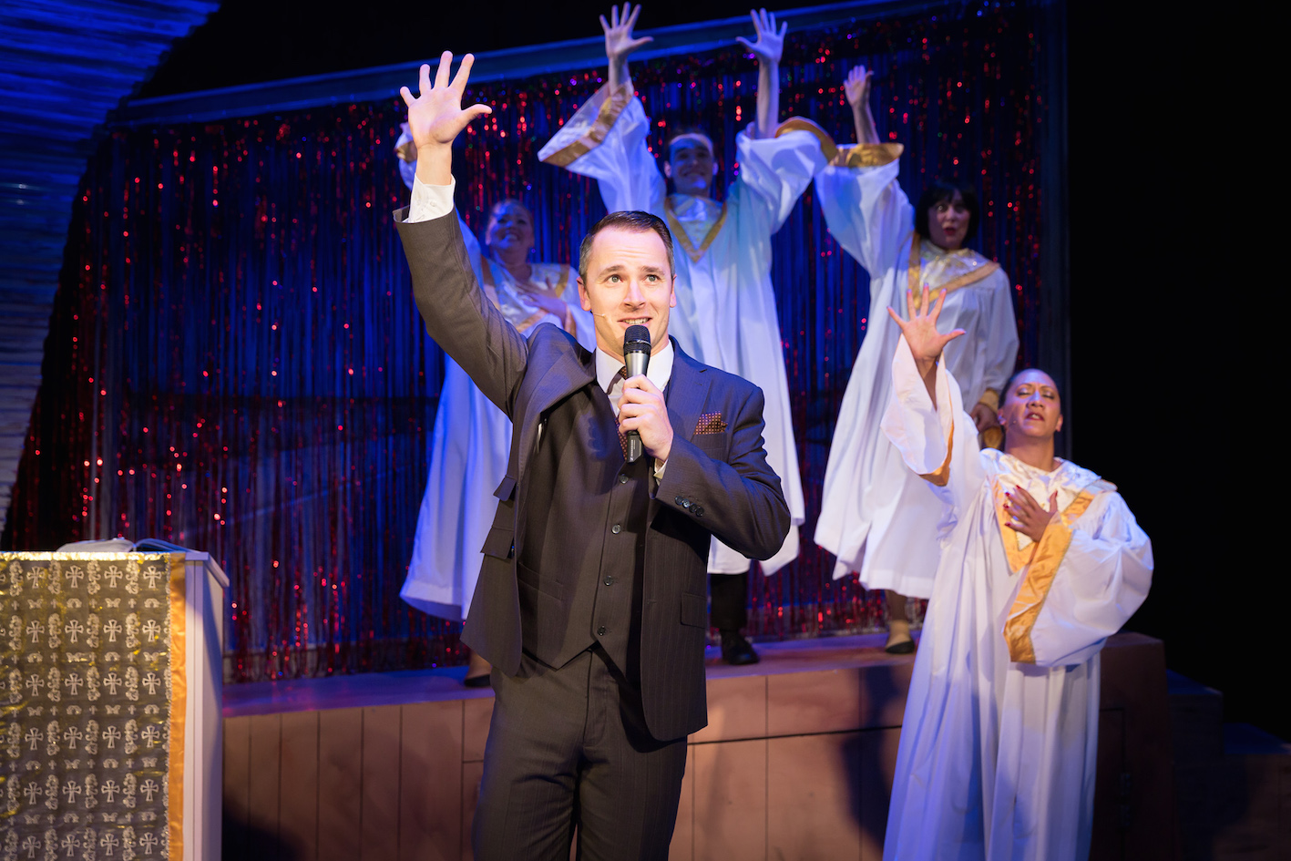 Each member of the ensemble cast has their moment to shine as well as giving strong support throughout the show. Cherine Peck belts out “Raise Me Up” as sassy gospel sing Lula Buffington. Jordan Pollard flips on a dime from the glossy television act of the Preacher to his sharp real life personality. Versatile young performer Jack O’Riley sweetly croons “Last Time I Came to Memphis” as Radio Singer. Ryan Gonzalez gives a sympathetic performance as the Preacher’s put-upon assistant Virgil. Katie Elle Reeve exudes perky flair as the Music Hall Singer performing “ Lonely Stranger.”