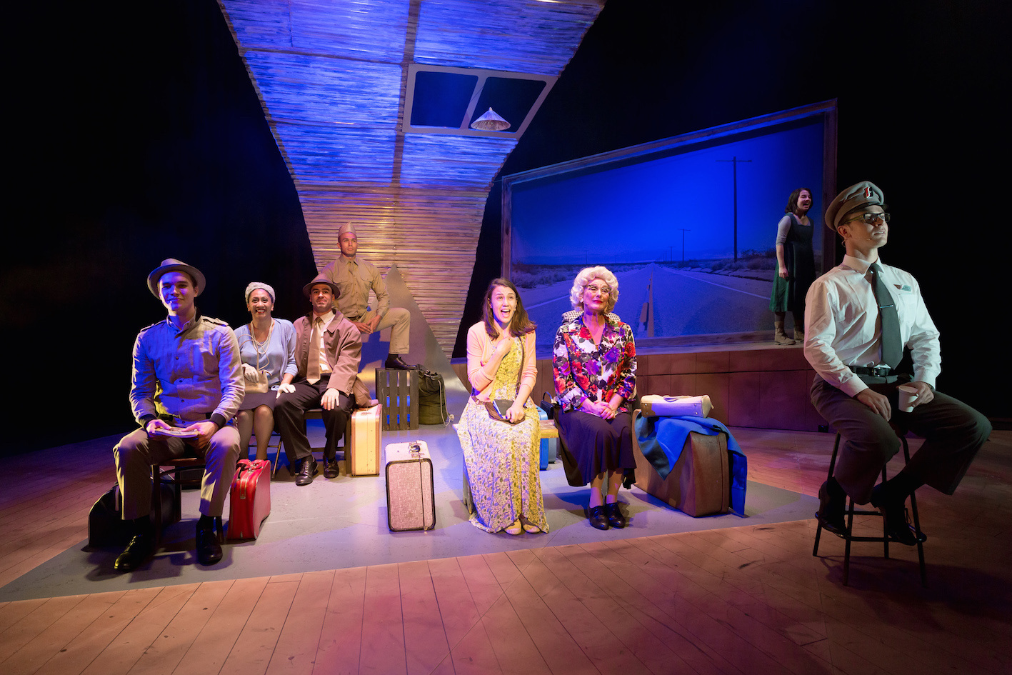 Using a set of chairs as varied as the characters, the Greyhound bus is represented in abstract formations. Simon Greer’s equally abstract physical collage setting of images of the road makes striking use of the tight space. Lucetta Stapleton’s costumes are grounded in reality but enhanced with a touch of theatrical flair.