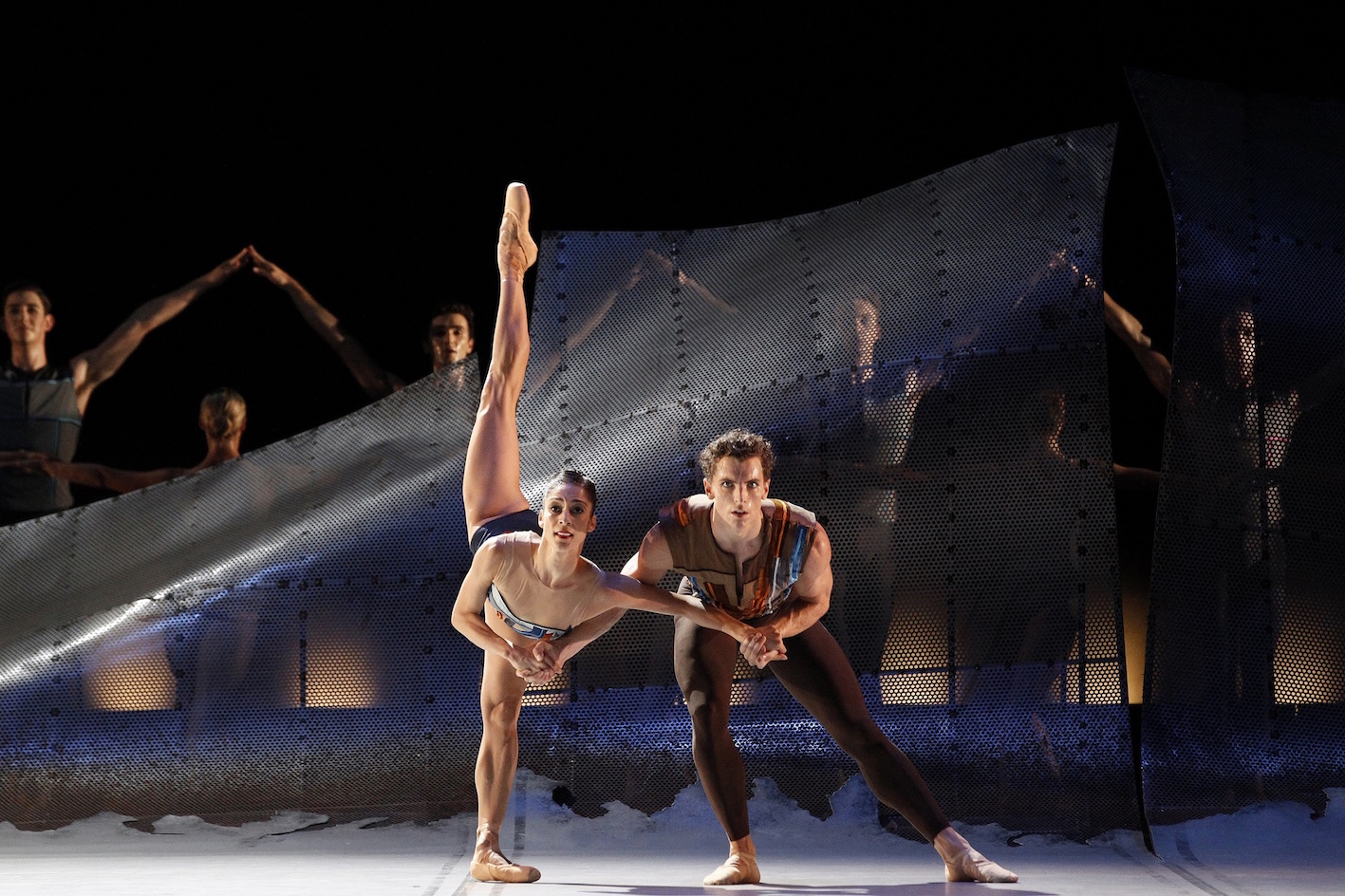 The lights rise slowly to reveal a rear landscape of curved metal. Stiff bodies sway and weave, representing standing train passengers. As the work progresses, Wheeldon stages impressive sequences in which mechanical synchronised movement of the dancers represents perpetual motion. Joining four lead couples, the presence of the corps de ballet means that the stage can often be filled with dancers. Both unison and canon work are a delight to watch.
