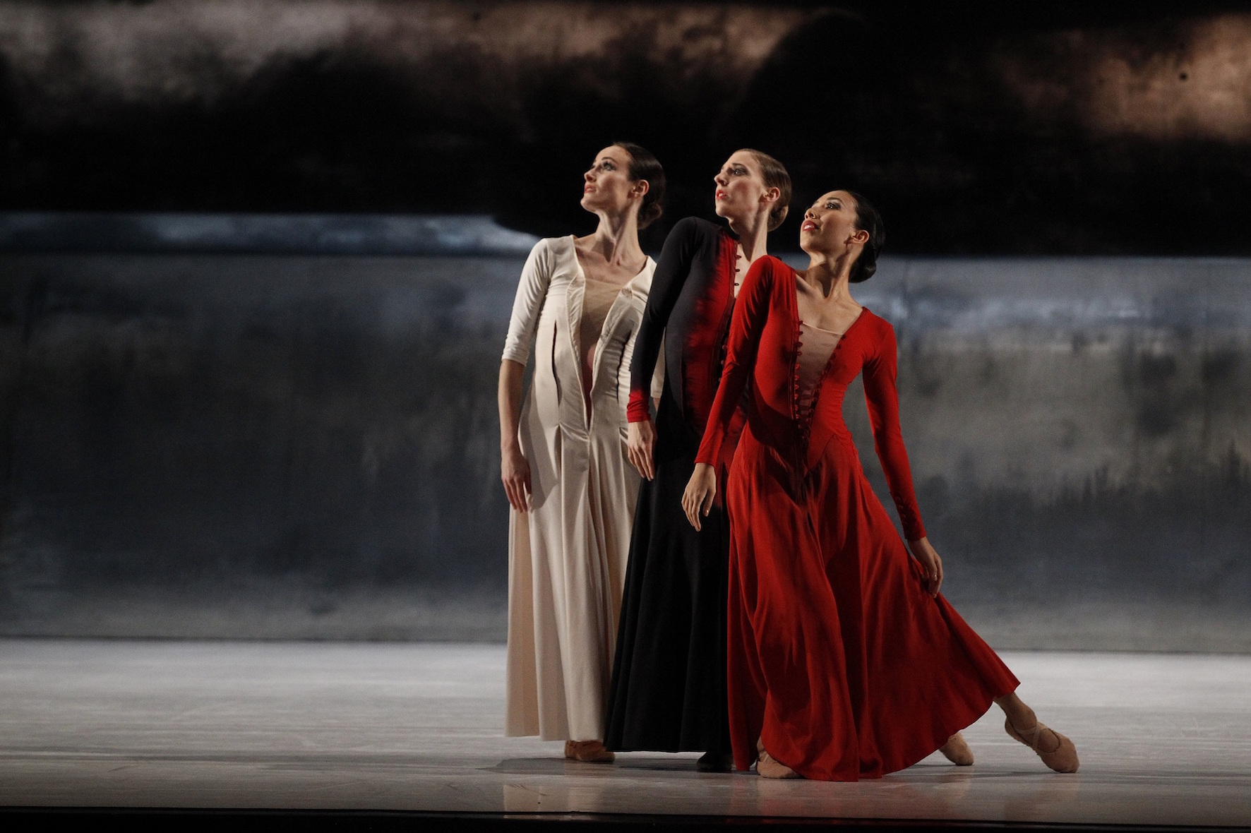 The piece has an extraordinary beginning, in which only the sound of wind accompanies the 12 dancers as they move in perfect unison without the benefit of the rhythm of music. Once the music begins, Britten’s Sinfonia da Requiem provides a melancholic atmosphere punctuated by resounding beats from the kettledrums and flares of energy from the brass.