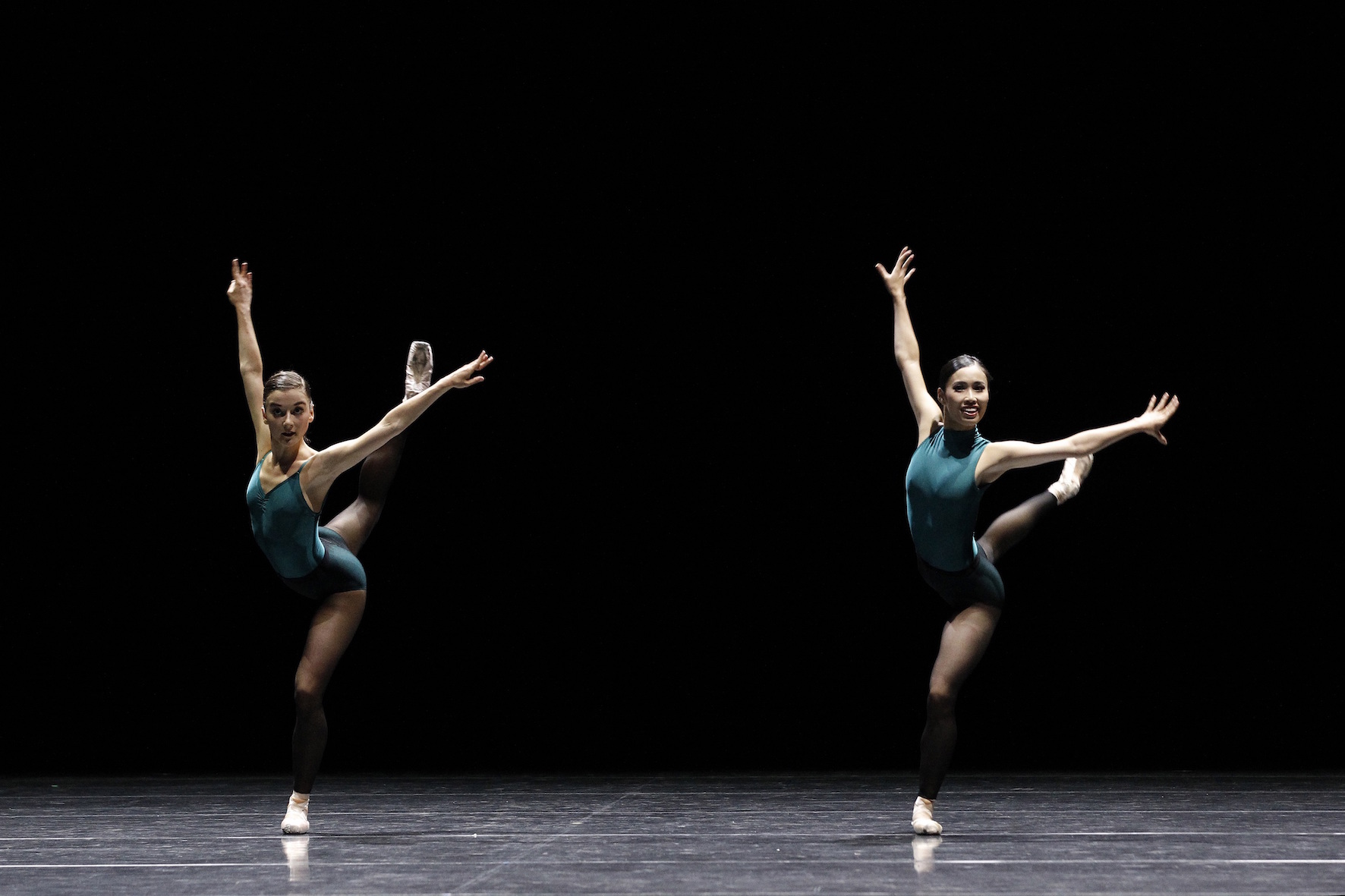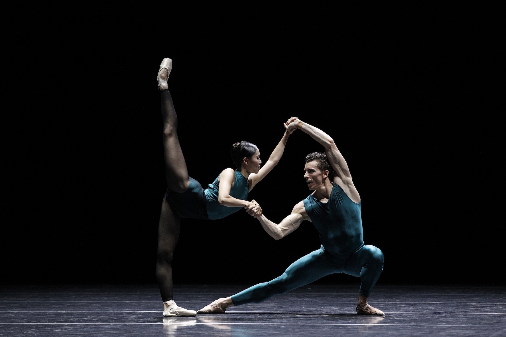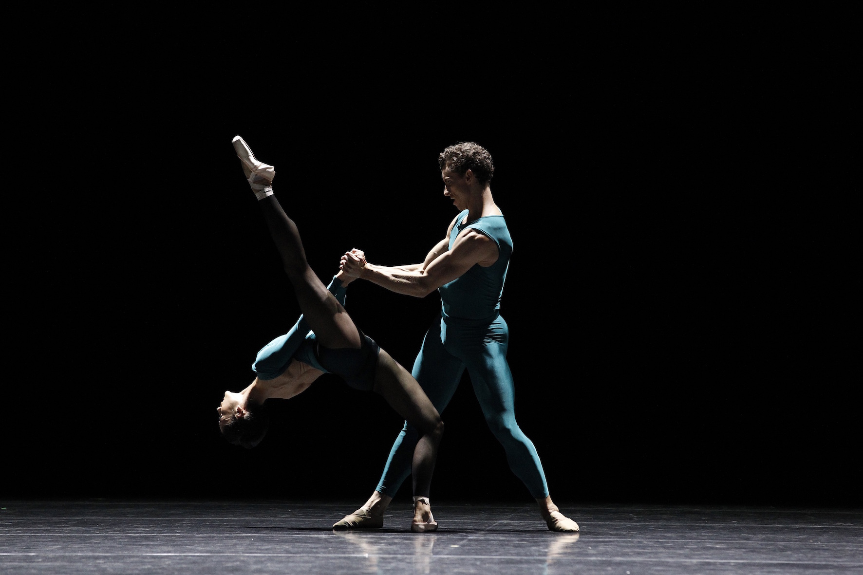 The second portion of the evening grabs the audience’s attention with an electric jolt from Willems and Stuck’s pre-recorded score as the curtain rises to reveal a vast black-box stage on which nine dancers sport variations of tight teal green Lycra. That electricity runs through William Forsythe’s In The Middle, Somewhat Elevated, as the relentless music and pristine variations create a mesmerizing effect on the audience.