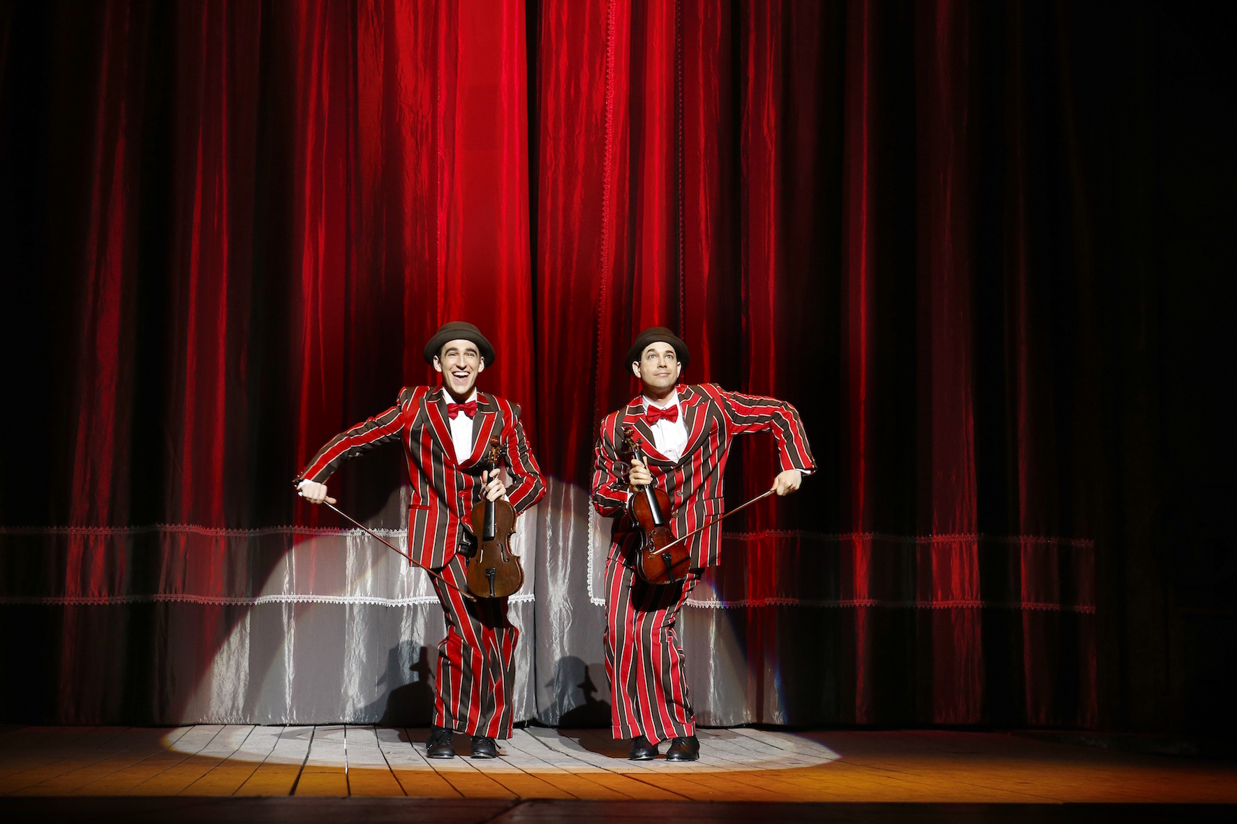 Now featured in half the musical numbers and a great many of the scenes, the ensemble is exquisitely styled in Higlett’s authentic period costumes and hairstyles. No hipsters too vain to shaves their facial fluff in this production. It’s high pants and argyle vests for the boys, and marcel waves, arched brows and cloche hats for the girls. Even the Technicolor outfits for the fantasy world of “Broadway Melody” stick to the period, with girls in a luscious rainbow of fringed flapper dresses.