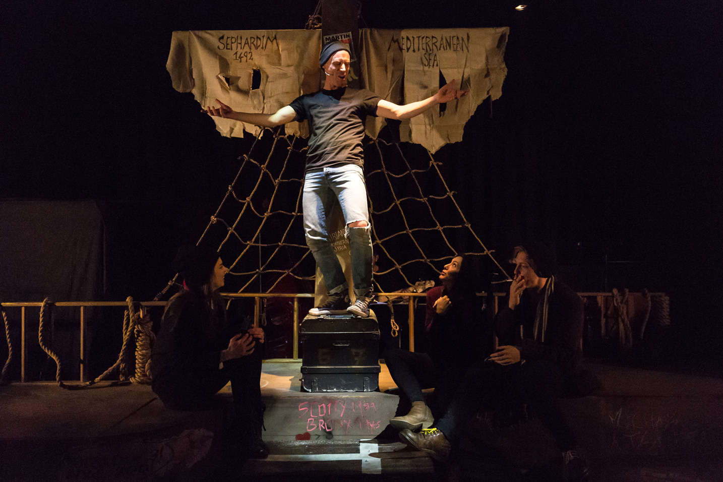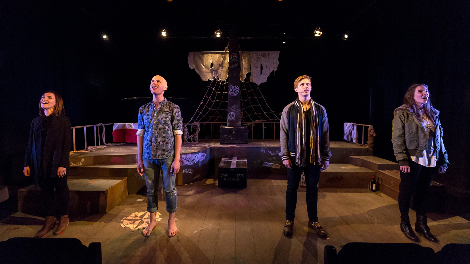 Taking inspiration from the concept of travelling to New World, which is specifically referenced in the second song, “On the Deck of a Spanish Sailing Ship, 1492,” designer Jacob Battista has created the appealing visuals of a ghostly ship’s deck. At first, the relic appears to have been subjected to graffiti, but as the show progresses, the scrawlings are seen to be the character names, places and years of each song. The setting provides an interesting array of levels, and props are cleverly contained in the ship’s battered crates.