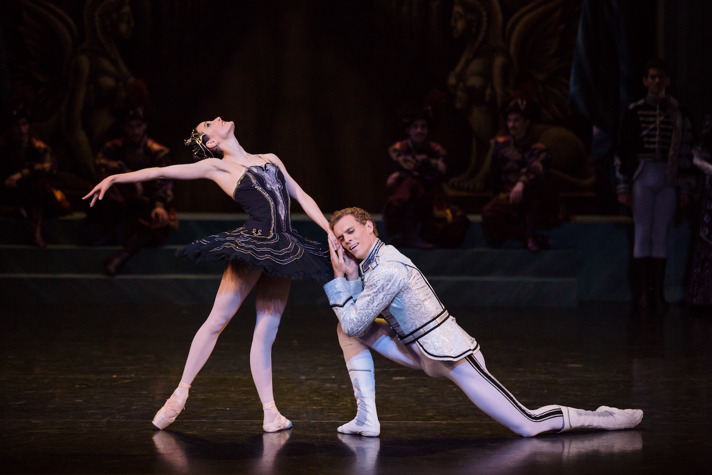 Rachel Burke’s lighting design covers scene transitions in inky blackness, allowing new elements to emerge as if by magic. Domenico Bartolo’s animated projections are used judiciously to suggest the arrival of the swan that becomes Odile then the flock that becomes the swan maidens.