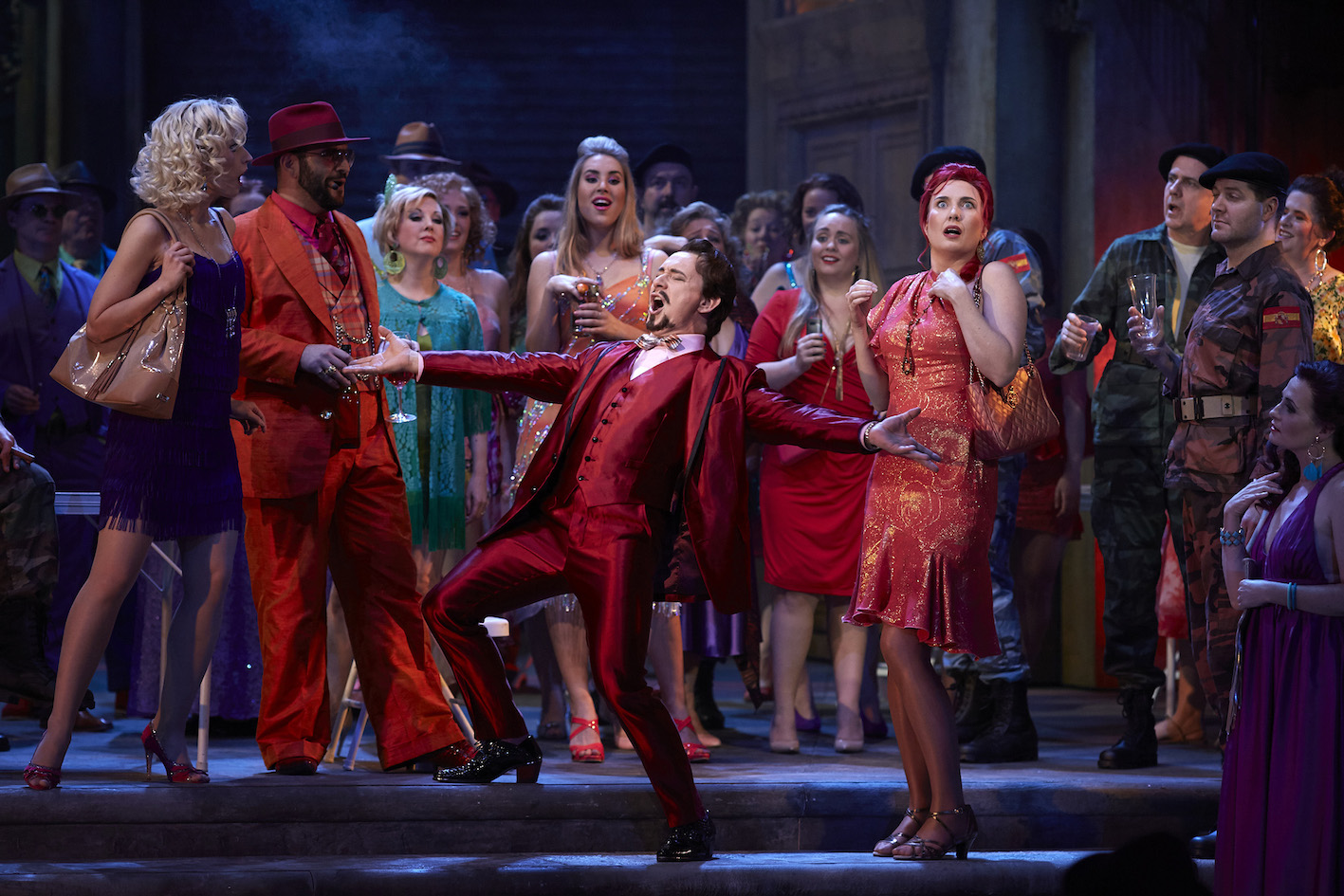 Jane Ede and American mezzo-soprano Margaret Trubiano give animated performances as Carmen’s friends Frasquita and Mercédès, tottering precariously in high heels and short nightclub dresses. The pair ably supports Margaine’s exceptionally precise work in the Card Trio, “Melons! Coupons!”.
