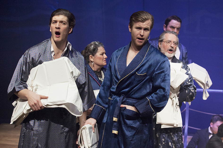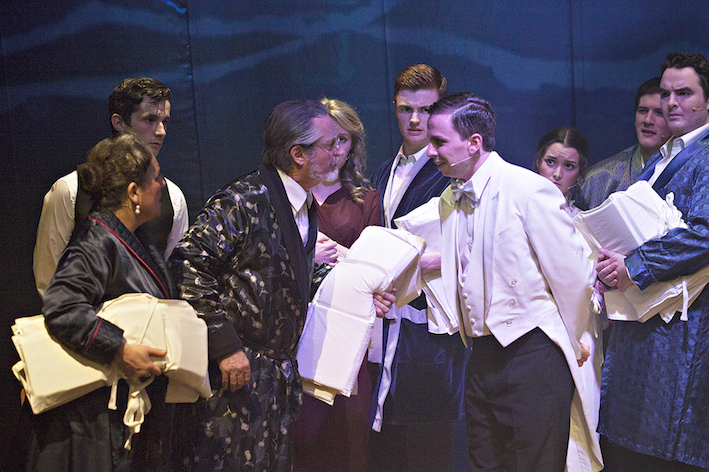 The simplified staging involves a raked wooden stage, with four string players, representing the ship’s steadfast band, nested in the upstage left corner. Set design is by Simon Coleman, Robbie Carmellotti and Cutler, and also includes sheer, gleaming blue fabric on three sides. Kai Mann-Robertson’s projections give an abstract, textured feel to the backdrop.